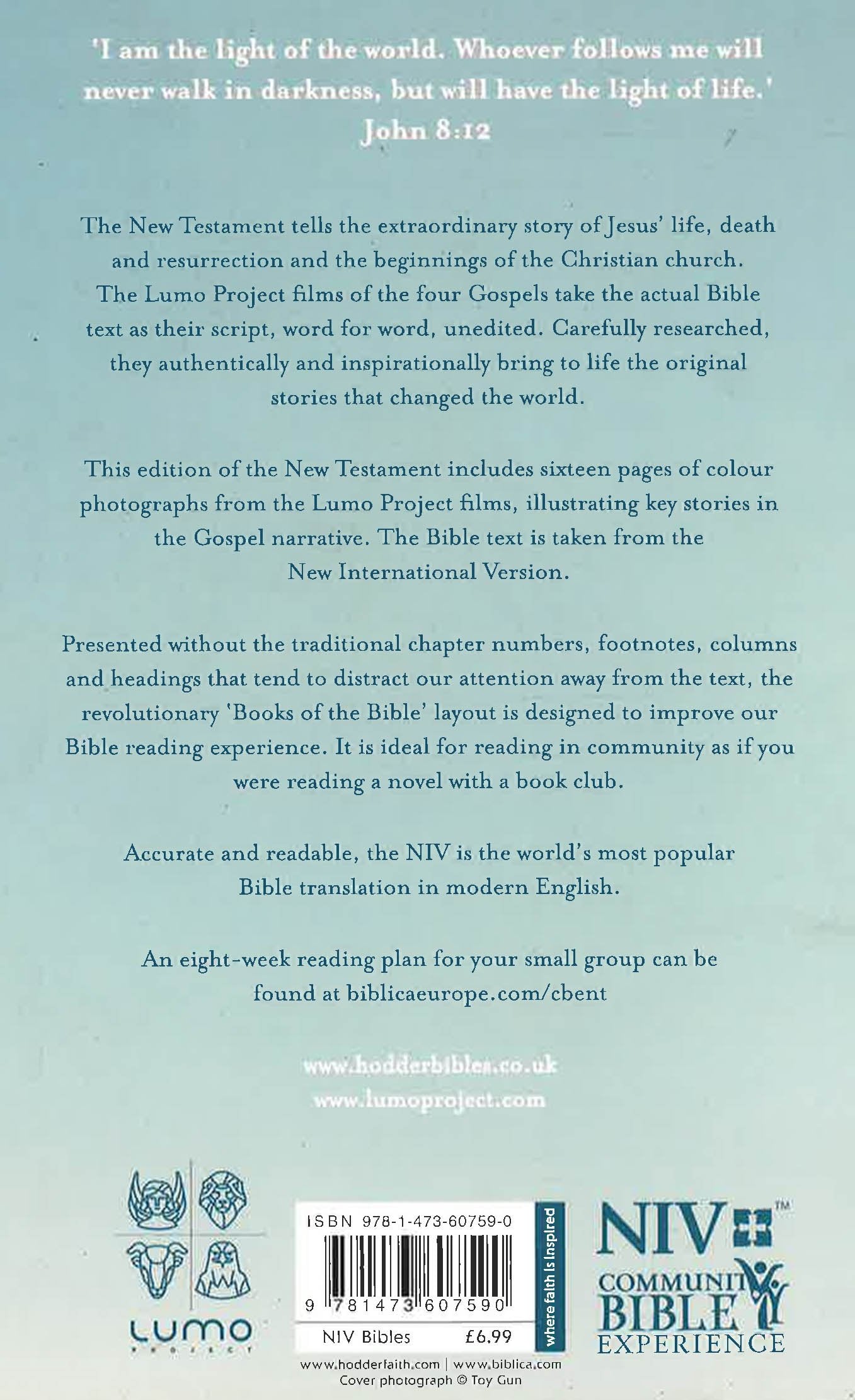 The Books of the Bible (New Testament) is a revolutionary new presentation of Scripture that strips away centuries of artificial formatting, leaving behind nothing but pure Bible text. The result is a Bible unlike any other available today, but more like the original Scriptures. The Books of the Bible is specially designed to be read from start to finish, as if you were reading a novel. Natural literary breaks have been restored and the books have been rearranged chronologically, rather than by length, leading to a more authentic presentation of the Bible. There is also a helpful introduction to each book that sets the text in context, rather than adding explanation or application. The NIV text is also set in single-column format, rather than in two columns as you usually find in the Bible. This aids reading longer chunks at a time, as you would if you were reading a novel for pleasure. This edition features colour photos from the LUMO Project films of the four Gospels - Matthew, Mark, Luke and John. The project has been informed by leading world experts' latest theological, historical and archaeological research on every aspect of life in first century Palestine. It was shot on location in Morocco, using the very latest 35mm digital film cameras to ensure picture quality of the very highest standard across a number of platforms - cinema, broadcast, BluRay, DVD and the web. The voice-over script is taken from the NIV Bible but the films have been shot with the intention of overlaying the Bible text in any language. These multi-language Biblical resources are set to transform the way in which people engage, discover and study the life of Jesus through the Gospels.