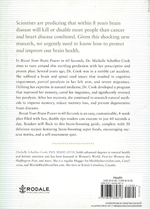 A new disease is emerging as the leading killer of North Americans: Scientists are predicting that within 8 years, brain disease will kill or disable more people than cancer and heart disease combined. Given this shocking new research, we urgently need to know how to protect and improve our brain health. In 60 Seconds to Boost Your Brain Power, Dr. Michelle Schoffro Cook aims to turn this prediction around with her prescriptive and proven plan. Several years ago, Dr. Cook was in a terrible car accident in which she suffered a brain injury, resulting in cognitive impairment, partial paralysis in her left arm, and severe migraines. Utilising her expertise in natural medicine, Dr. Cook developed a program that improved her memory, cured her migraines, and reversed her arm paralysis. After her recovery, she continued to research natural methods to improve memory, reduce memory loss, and prevent degenerative brain diseases. Now, Dr. Cook is sharing her successful plan in this easy, customizable 4-week plan filled with fun, doable tips readers can execute in just 60 seconds a day. Complete with 50 delicious recipes featuring brain-boosting super foods, success stories, and a self-assessment quiz, readers will flock to this brain-boosting guide.