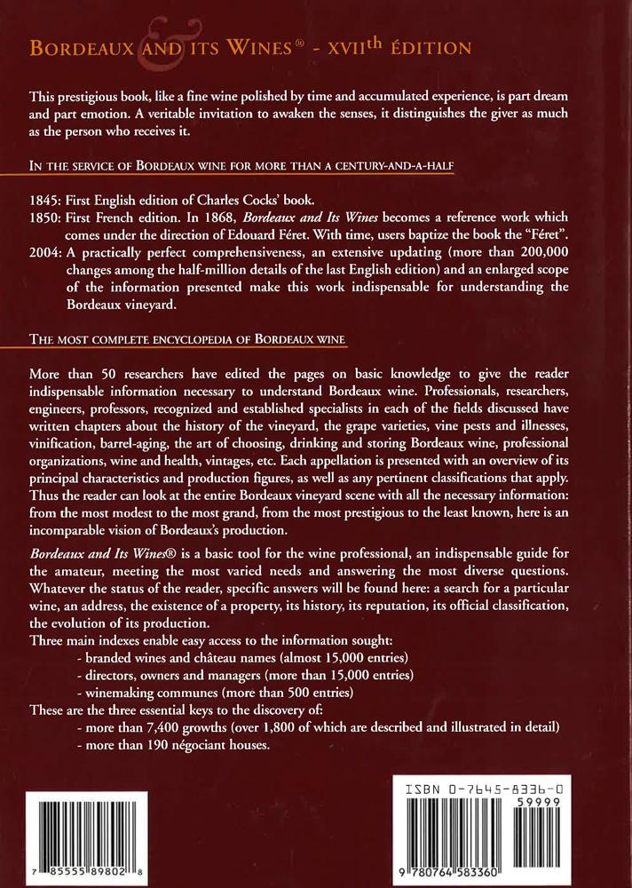 One of the most influential wine books of all time" (Lawrence Osborne, The Accidental Connoisseur), Bordeaux and Its Wines, now in its seventeenth edition, is the ultimate book on the most legendary of all wine regions. Since 1846, "the classic reference work on Bordeaux wines" (Jancis Robinson, The Oxford Companion to Wine) has guided wine connoisseurs, wine professionals, and vineyard investors through this complex region, providing detailed information on every one of its 1,800 vineyards, more than 14,500 wine brands, and 200 wine merchants. No other title comes close to the comprehensive information on Bordeaux wines and wineries presented in this book. While 'Feret, as it is colloquially known, is used by professionals for its comprehensive treatment of all facets of the Bordeaux wine region and industry, there is also information on the art of selecting, drinking and storing Bordeaux. Bordeaux and Its Wines is indispensable for the serious wine enthusiast.