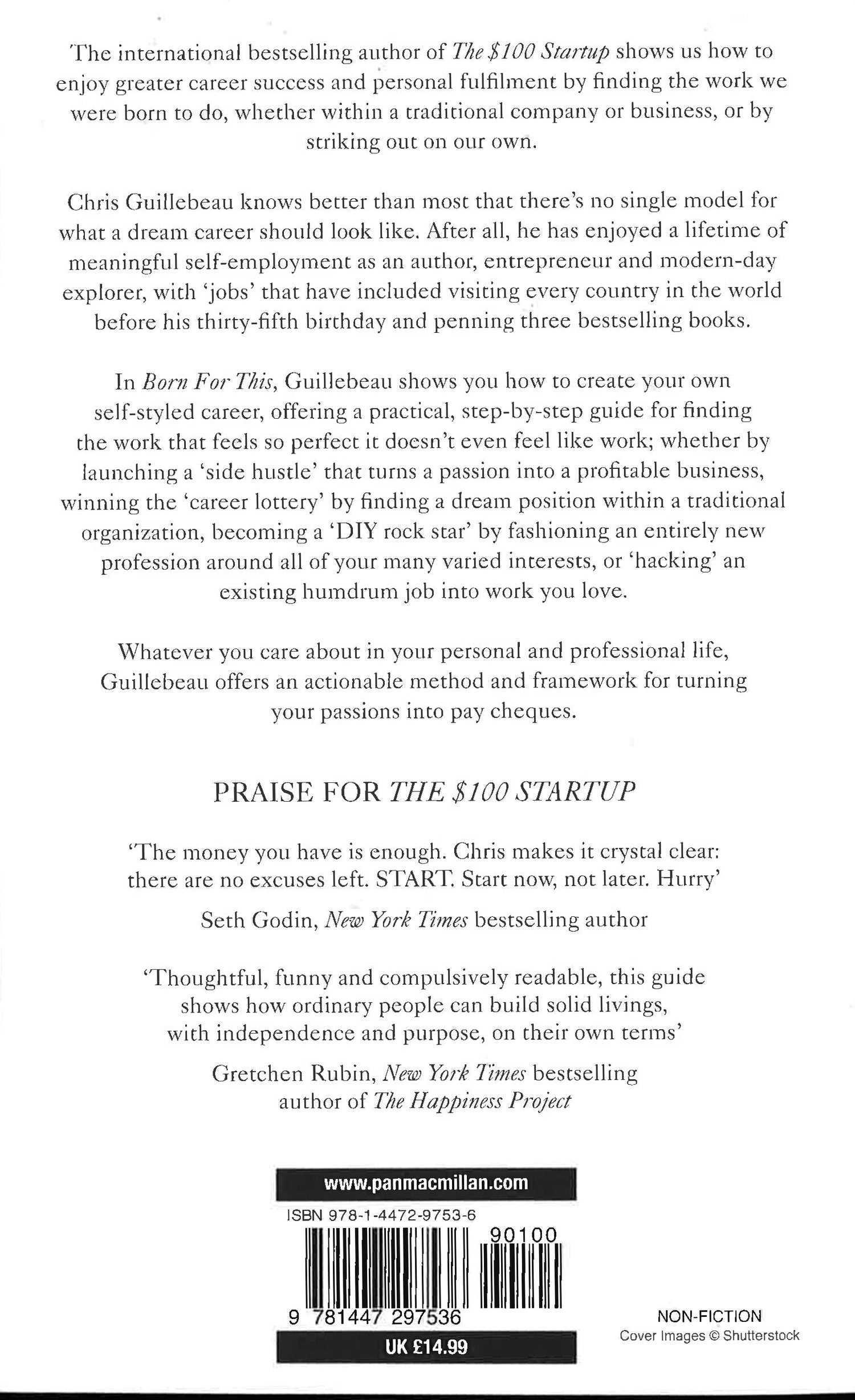 The New York Times bestselling author of The $100 Startup shows us how to enjoy greater career success and personal fulfilment by finding the work we were born to do, whether within a traditional company or business, or by striking out on our own. In Born For This, Chris Guillebeau shows readers how to create their own self-styled career, offering a practical, step-by-step guide to finding work that feels so right it doesn't even seem like work. Whether this is by launching a side job that turns a passion into a profitable business, winning the career lottery by finding a dream position within a traditional organization, becoming a DIY rock star by fashioning an entirely new profession around our varied interests, or hacking an existing humdrum job into work we will love, Guillebeau offers an actionable method and framework for turning our passions into paychecks.