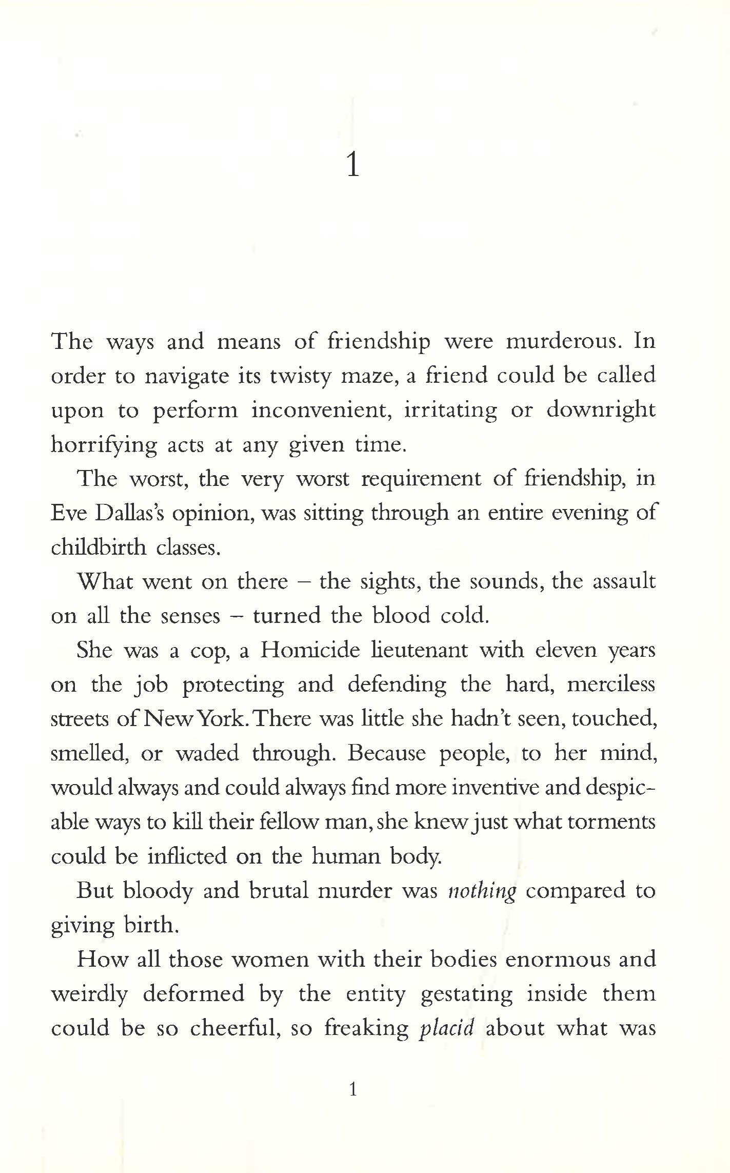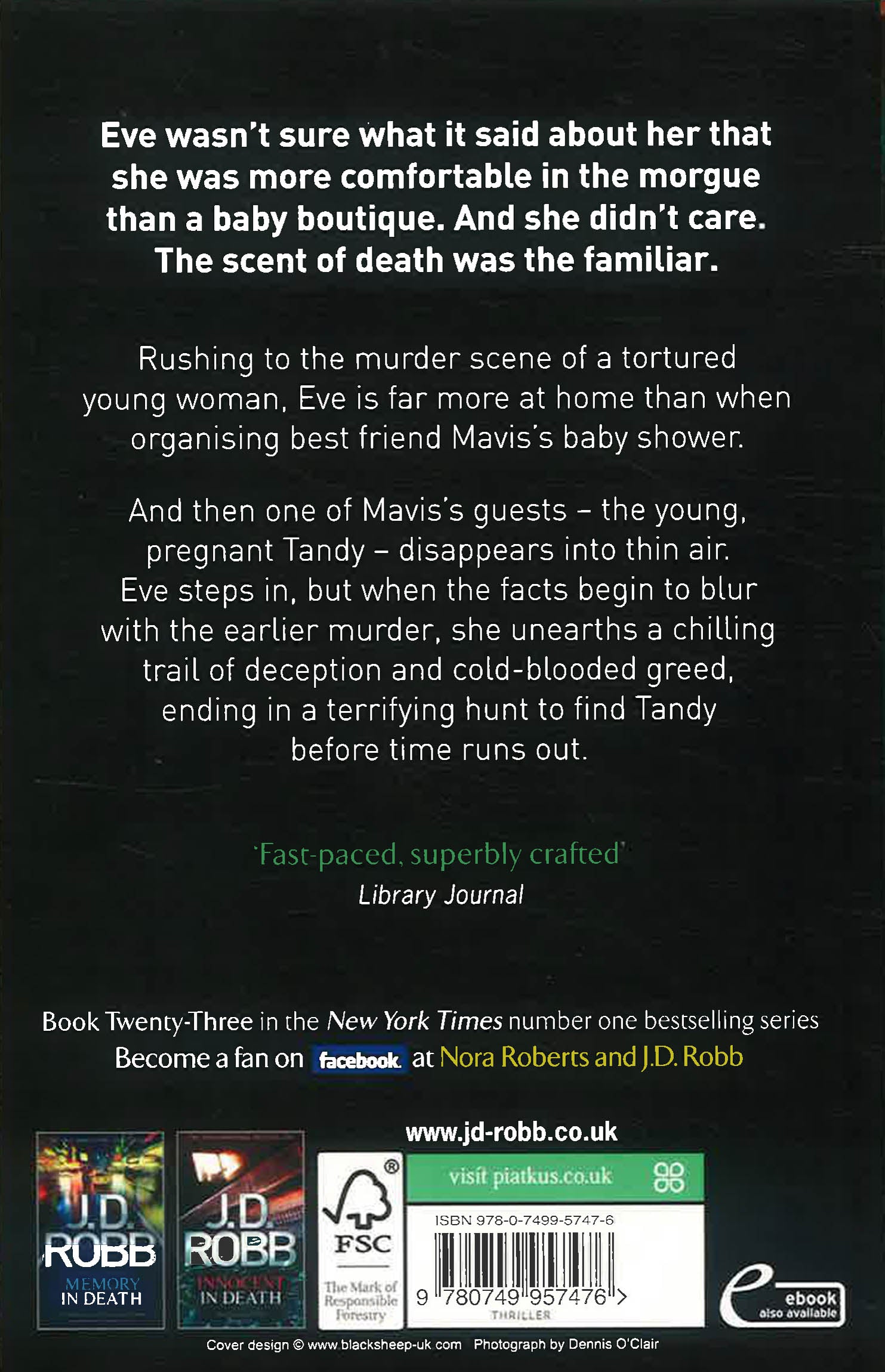 Just as Eve Dallas begins to investigate the grisly double homicide of two young lovers—both employees of the same prestigious accounting firm—her friend Mavis need a favor. One of the moms-to-be in Mavis’s birthing class has gone missing. Normally, such a case would be turned over to Missing Persons. But Mavis wants no one else on the job—and Eve can’t say no.