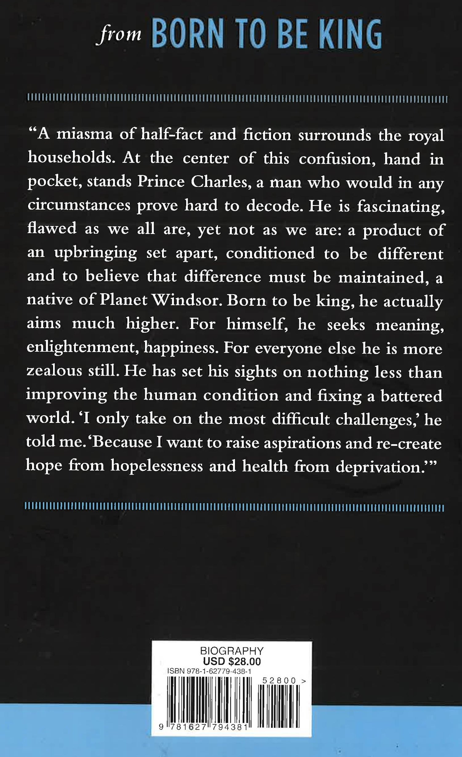 A provocative, surprising, and utterly fresh portrait of Charles, Prince of WalesHe is one of the world's most fascinating and least understood figures: now sixty-six, Prince Charles has spent his entire life preparing to be king while insisting on being his own man. In this brilliant portrait, he emerges as a complex character driven by a painful past, a questing intellect, and a powerful impulse not only to reshape the monarchy but to use the long wait for the throne to work toward high ideals.Based on exclusive interviews with members of Charles's inner circle and on rare access to the Prince himself, this revelatory biography takes us deep into the royal sphere a world of its own that Catherine Mayer calls Planet Windsor and shows us the skullduggery and unintentional comedy of court life. At the same time, it provides a clear-eyed view of Charles's struggles and his achievements as a philanthropist and activist. The book also offers a fundamental reappraisal of one of the most documented episodes in modern history his marriage to Diana. The reality, as with many aspects of the Prince's story, is more gripping and more poignant than we knew.Now closer than ever to achieving happiness, the Prince is still far from settled. He remains committed to bringing about social and political change, but in aiming to be a king of hearts, he often creates heartache, for himself and others. "Born to Be King" explains how and why Charles may redefine the role of the sovereign, even as it reveals the astonishing extent to which the Prince has already left his mark on the world."