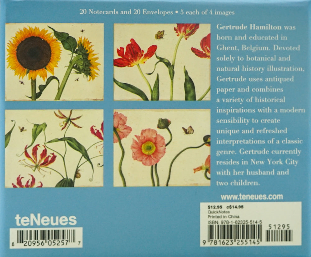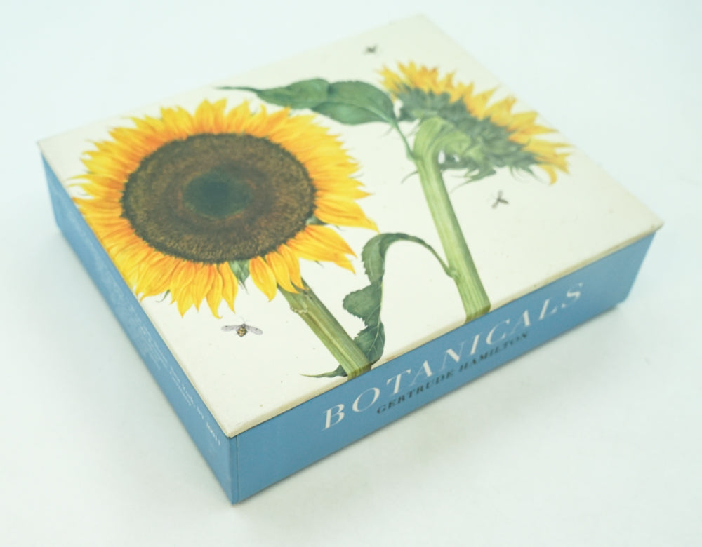 20 notecards, 5 each of 4 images. 20 envelopes. Magnetic closure. Sturdy, reuseable box, ideal for keepsakes. Measures 14.3 x 12 x 3.5cm