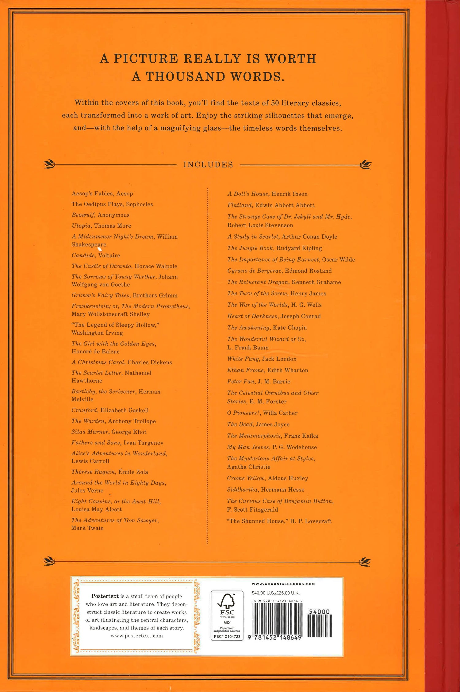 In this book, a picture is indeed worth a thousand words. Within its covers are 50 literary classics, deconstructed and then put back together word by word to create singularly beautiful pieces of art. The silhouettes that emerge from the text illustrate the central characters, landscapes and themes of each story. This collection ranges across the canon, from 620 BCE to 1937. Bibliophiles will find many of their favourite reads as well as lesser-known gems to discover or rediscover. Each piece of art contains an entire text in legible type, so that, with the help of the magnifying glass on a ribbon marker, readers can enjoy both the striking images and the timeless words themselves.