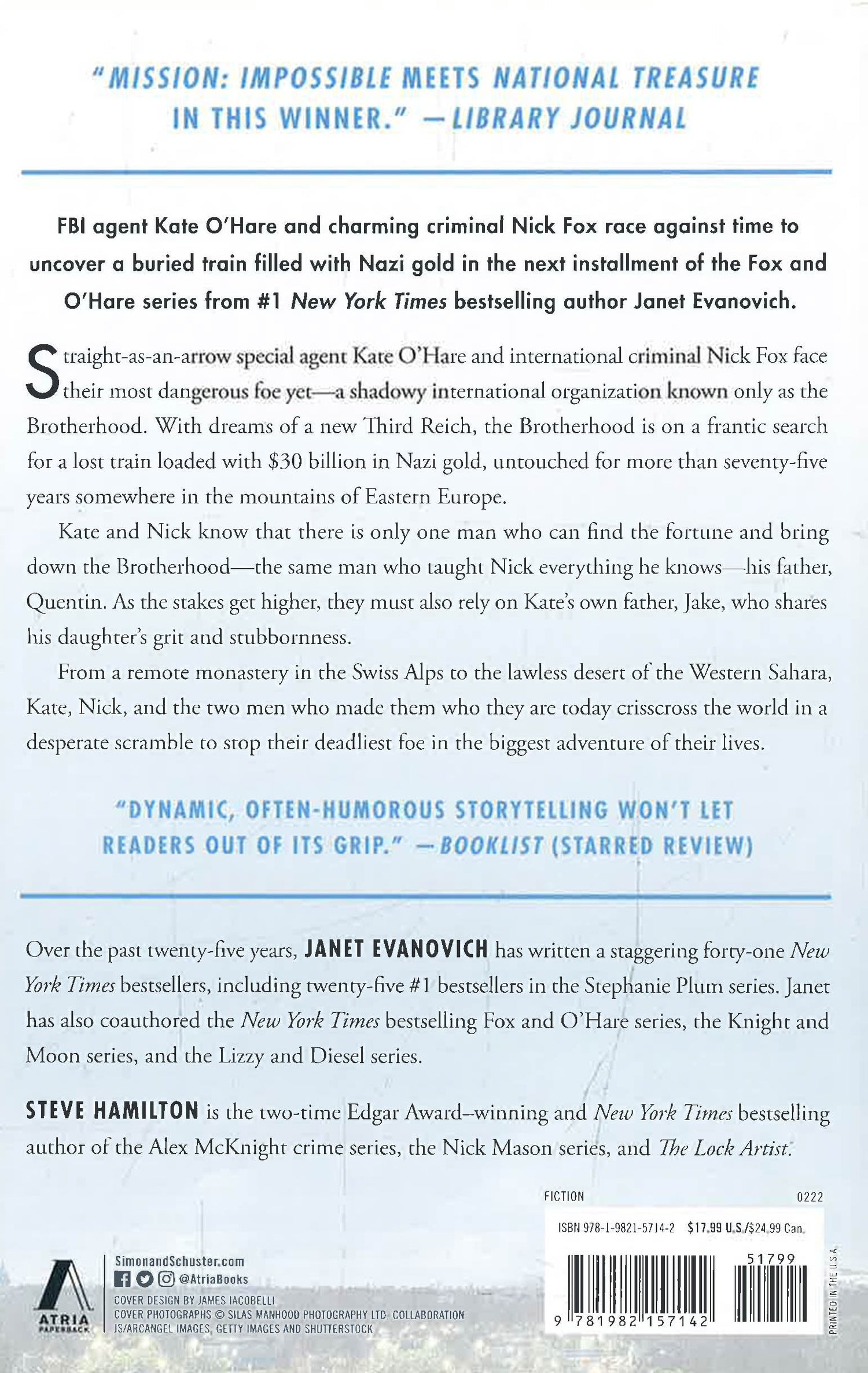 In the latest instant New York Times bestseller in the Fox O’Hare series, FBI agent Kate O’Hare and charming criminal Nick Fox race against time to uncover a buried train filled with Nazi gold—from the #1 New York Times bestselling author Janet Evanovich.