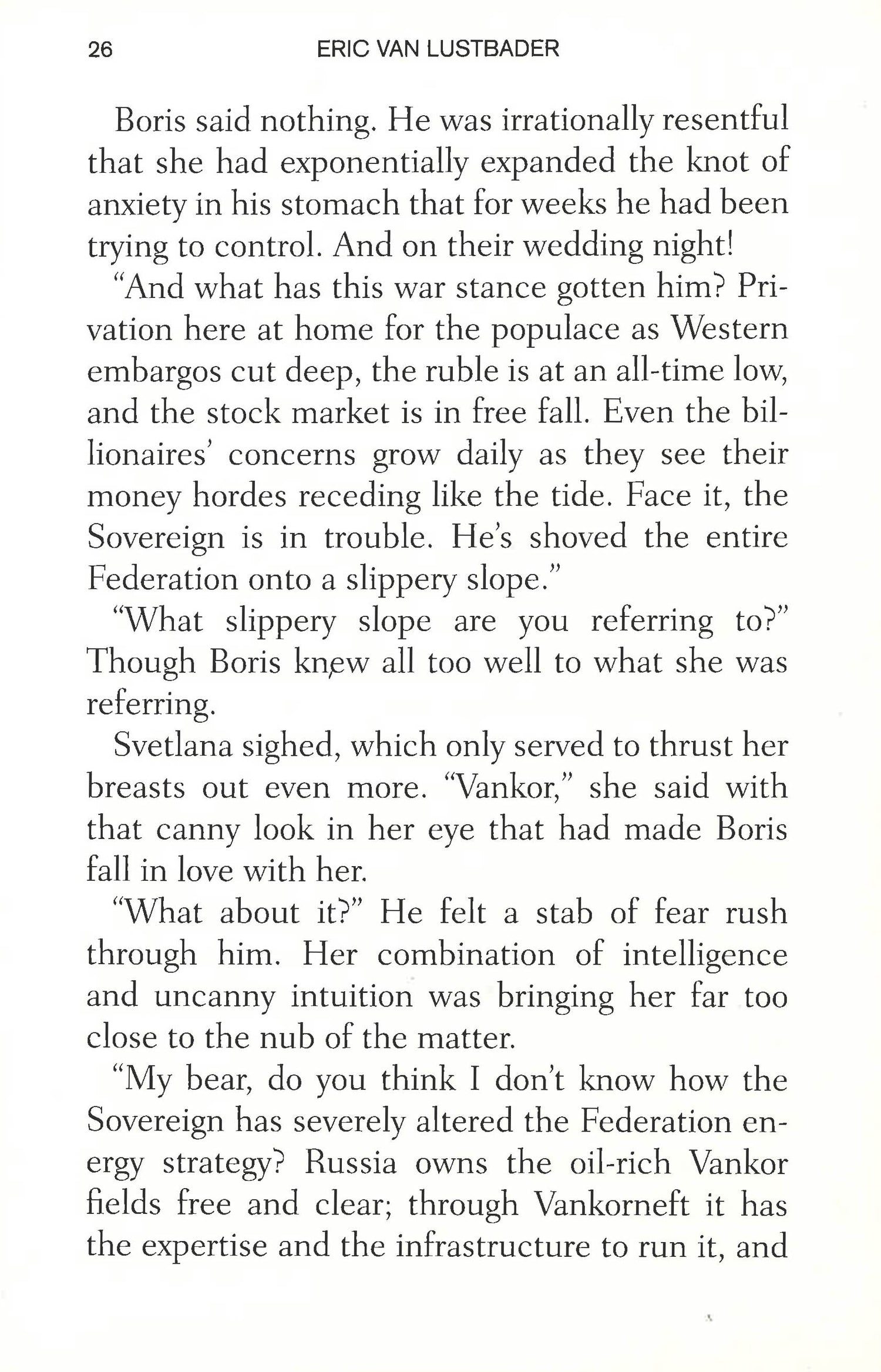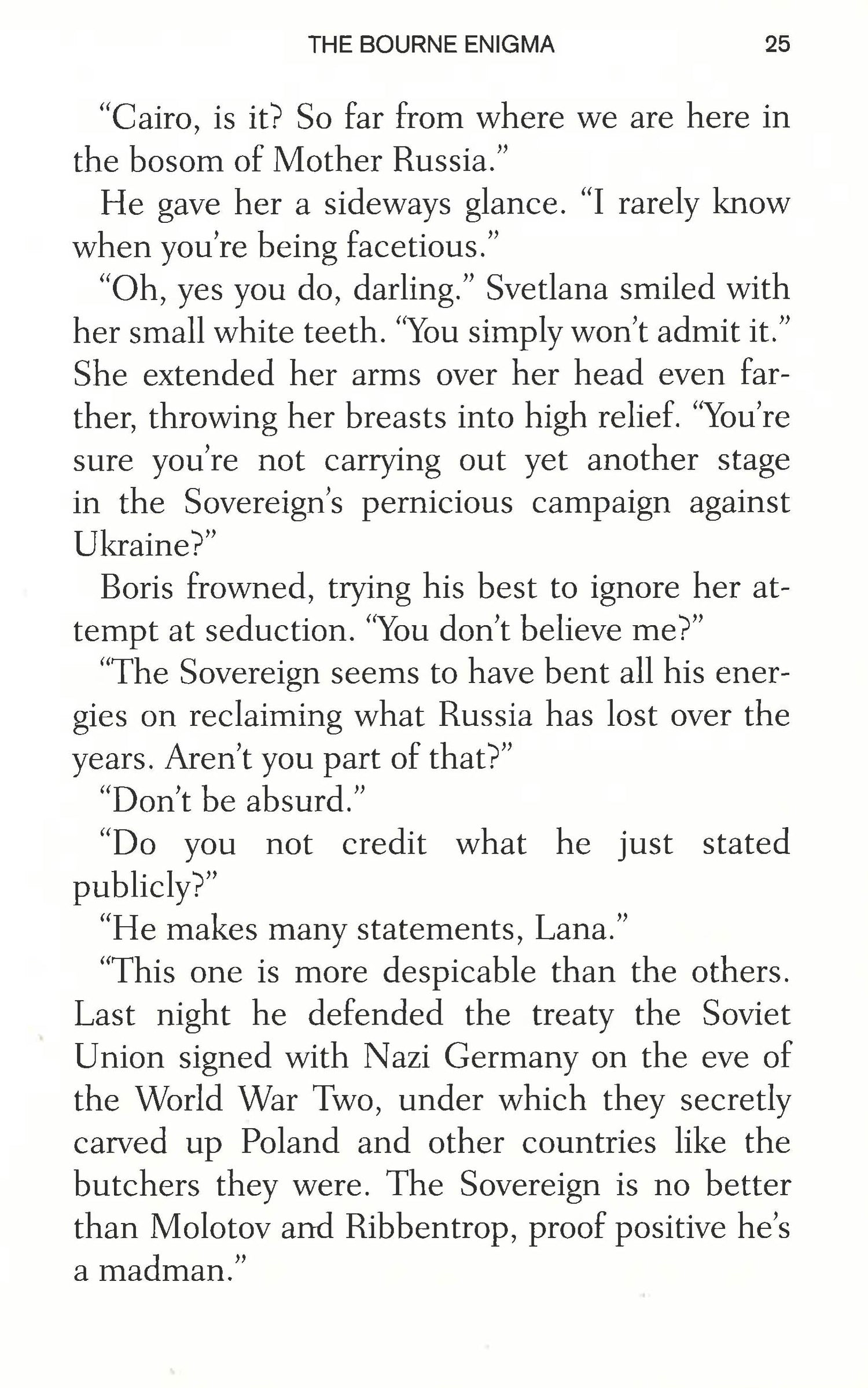 On the eve of Russian general Boris Karpov's wedding, Jason Bourne receives an enigmatic message from his old friend and fellow spymaster. In Moscow, what should be a joyous occasion turns bloody and lethal. Now Bourne is the only one who can decipher Karpov's cryptogram. He discovers that Karpov has betrayed his sovereign to warn Bourne of a crippling disaster about to be visited on the world. Bourne has only four days to discover the nature of the disaster and stop it.The trail Karpov has been following leads Bourne to Cairo and the doorstep of Ivan Borz, the elusive international arms dealer infamous for hiding behind a never-ending series of false identities, a man Bourne has been hunting ever since he abducted former Treadstone director Soraya Moore and her two-year-old daughter and brutally murdered Soraya's husband.Bourne must travel to war-torn Syria and then Cyprus as he chases the astonishing truth. The clock is ticking, and Bourne has less than four days to solve Karpov's riddle--and hunt down Borz--if he hopes to prevent a cataclysmic international war . . .