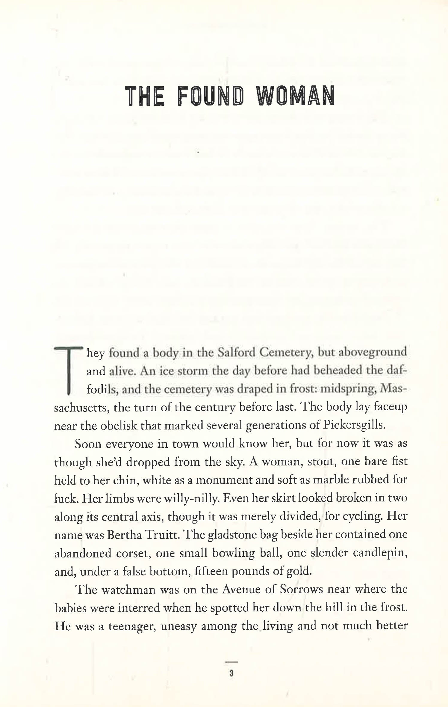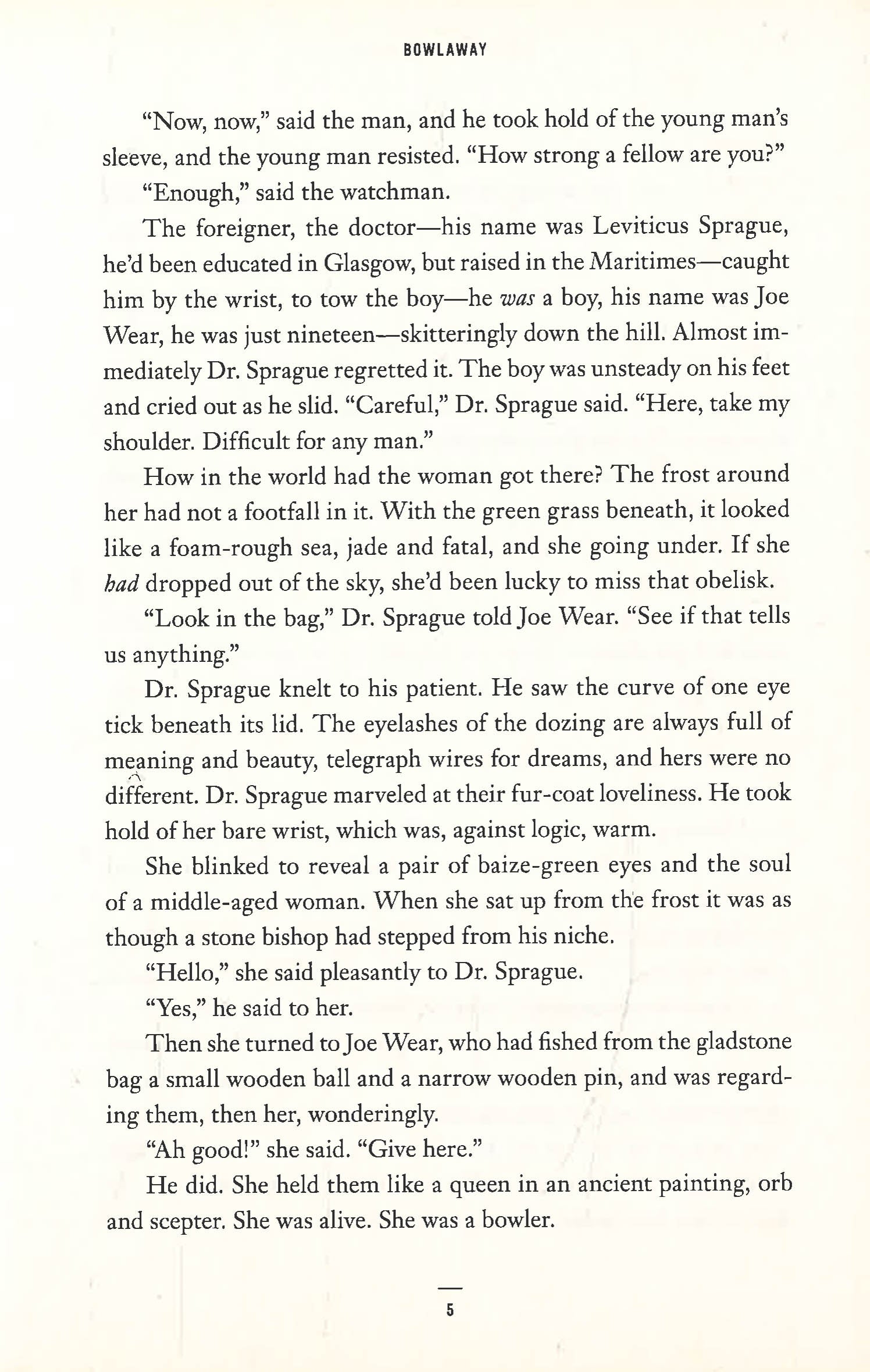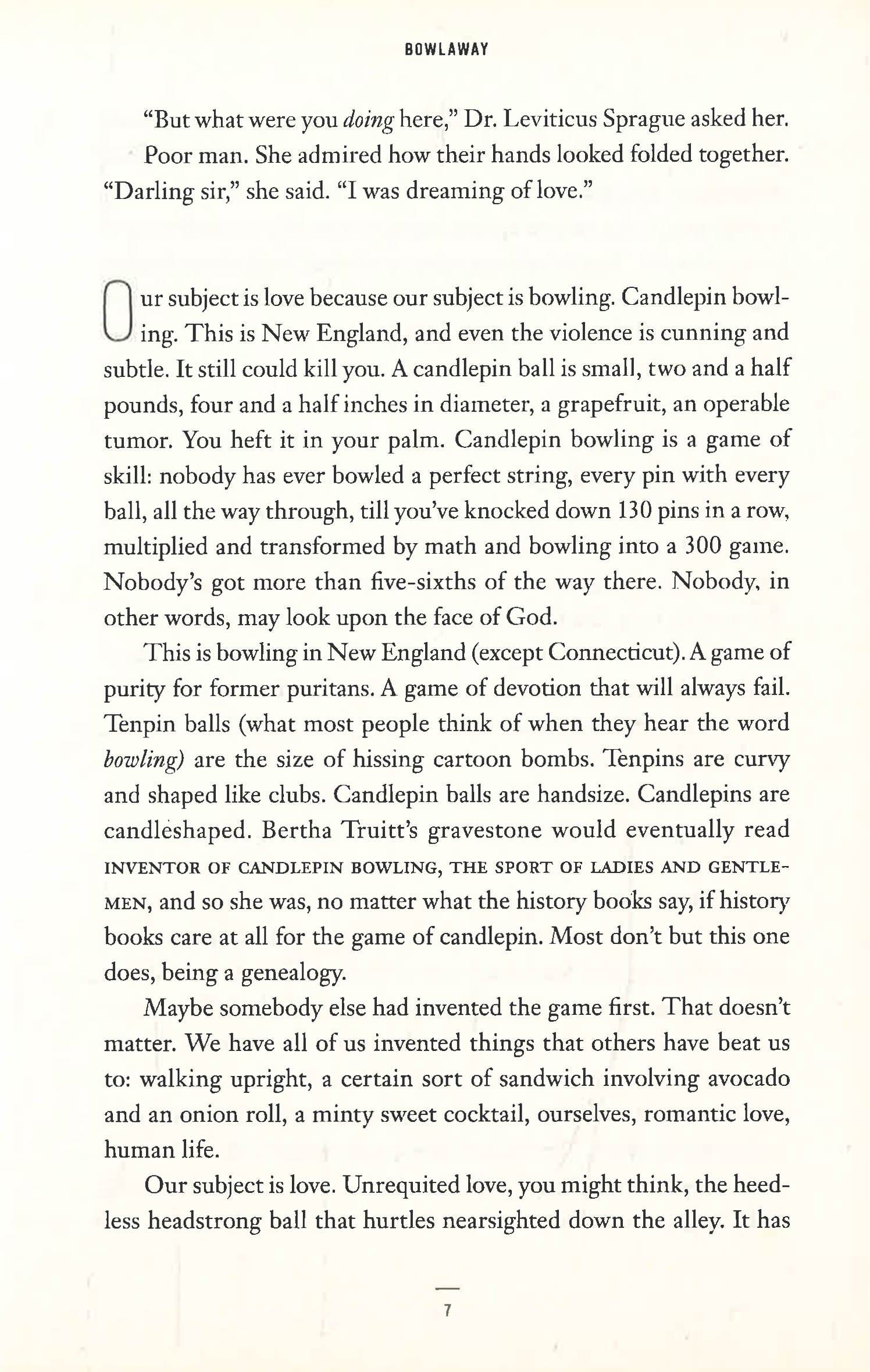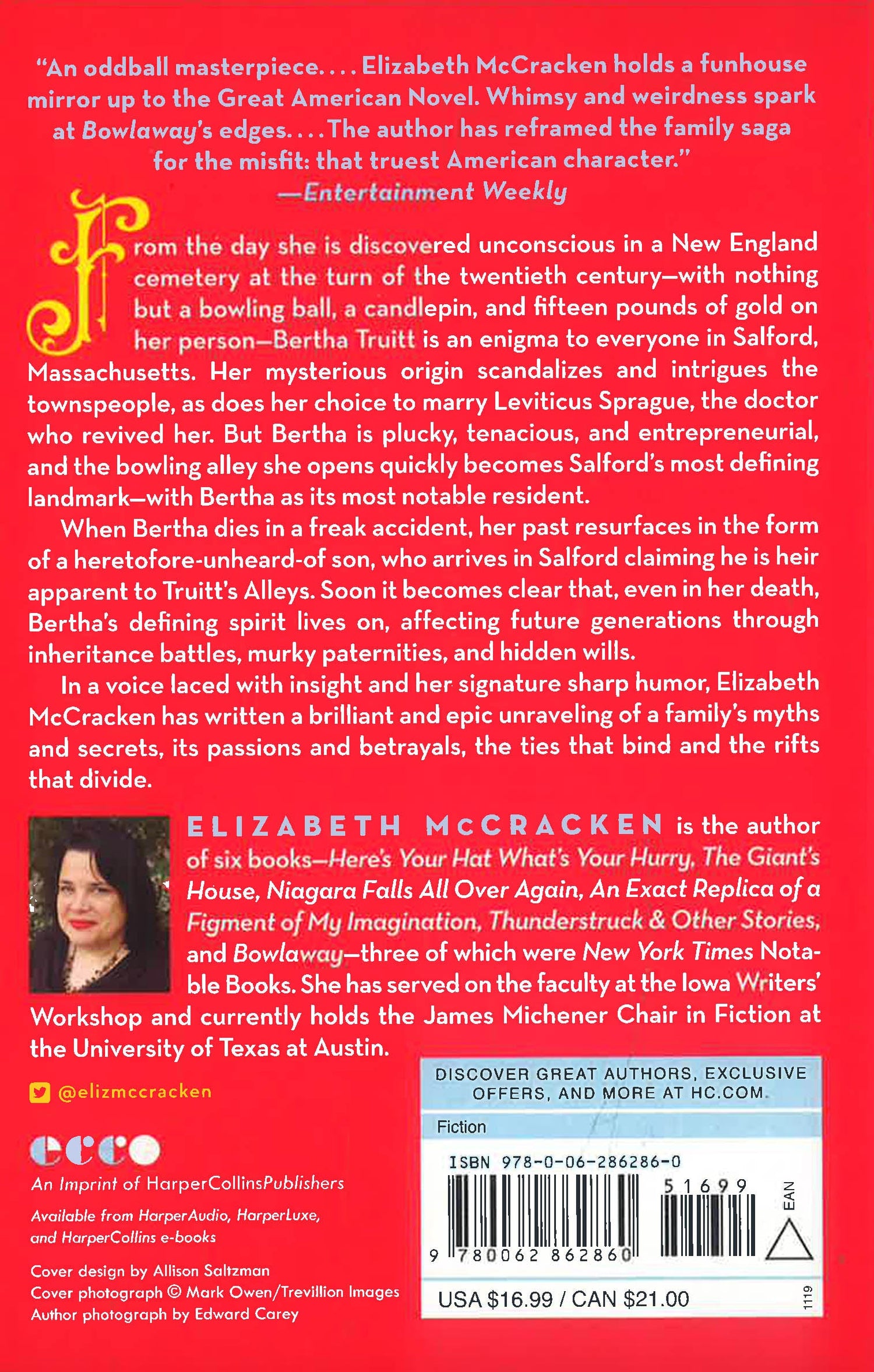 From the day she is discovered unconscious in a New England cemetery at the turn of the twentieth century—nothing but a bowling ball, a candlepin, and fifteen pounds of gold on her person—Bertha Truitt is an enigma to everyone in Salford, Massachusetts. She has no past to speak of, or at least none she is willing to reveal, and her mysterious origin scandalizes and intrigues the townspeople, as does her choice to marry and start a family with Leviticus Sprague, the doctor who revived her. But Bertha is plucky, tenacious, and entrepreneurial, and the bowling alley she opens quickly becomes Salford’s most defining landmark—with Bertha its most notable resident.