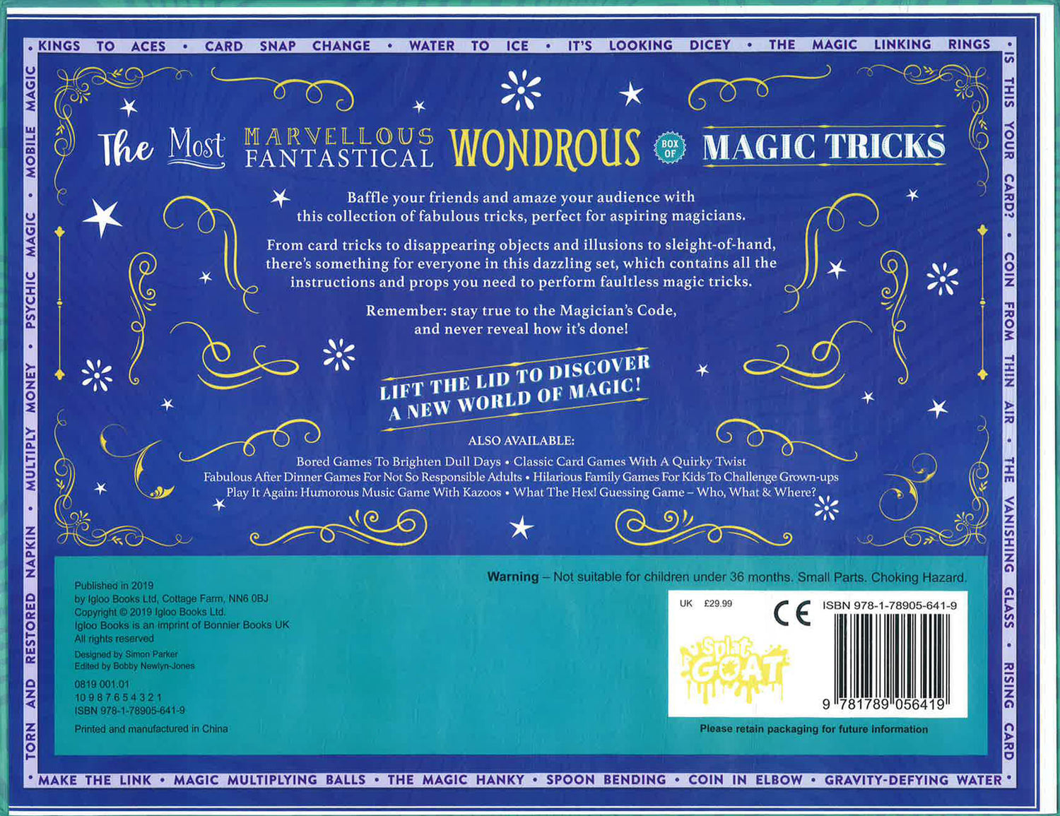 Baffle your friends and amaze your audience with this collection of fabulous tricks, perfect for aspiring magicians. From card tricks to disappearing objects and illusions to sleight-of-hand, there's something for everyone in this dazzling set, which contains all the instructions and props you need to perform faultless magic tricks. Remember, stay true to the Magician's Code and never reveal how it's done!