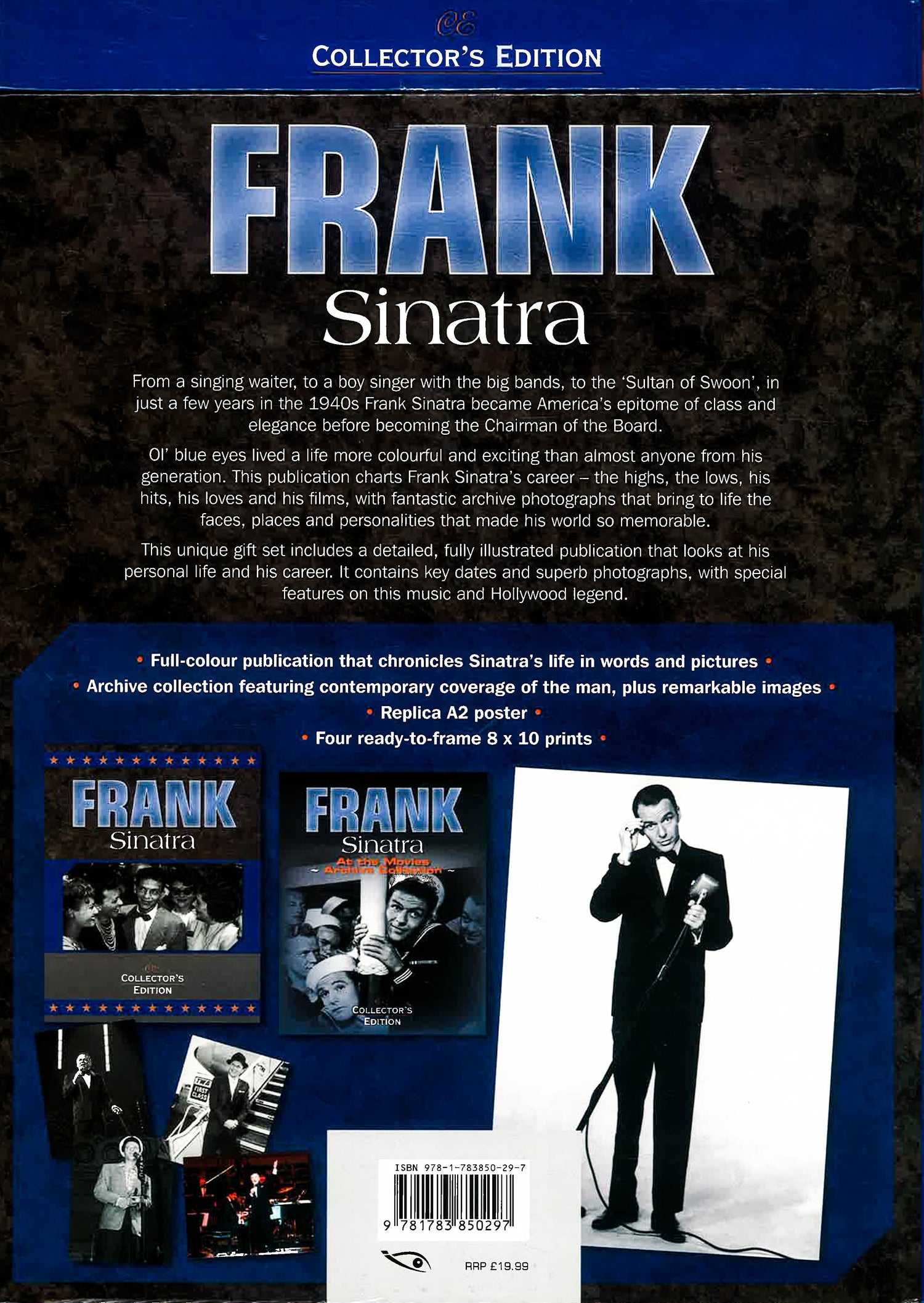 just a few years in the 1940s Frank Sinatra became America's epitome of class and elegance before becoming the Chairman of the Board. Ol' blue eyes lived a life more colourful and exciting than almost anyone from his generatior. This publ cation charts Frank Sinatra's career - the highs, the lows, his hits, his loves and his films, with fantastic archive photographs that bring to life the Faces, places and personalities that made his world so memorable. This unique gift set includes a detailed, fully illustrated publication that looks at his personal life and his career. It contains key dates and superb photographs, wilk: special features or this music and Hollywood legend.