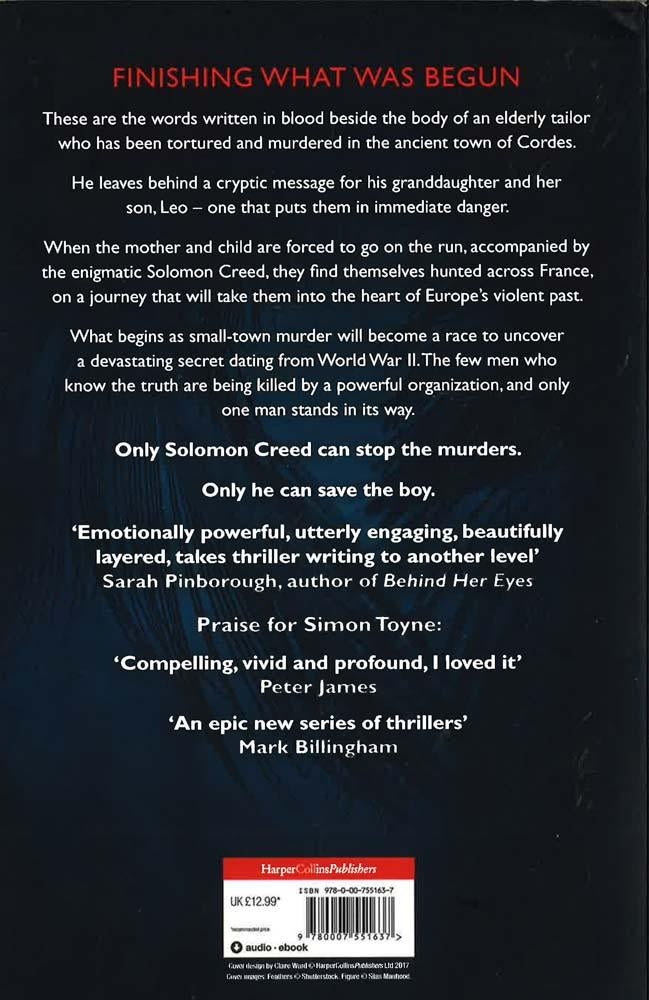 The electrifying new thriller from Sunday Times bestselling author, Simon Toyne. Only one boy can see the darkness. Only one man can save him from it. 'Perfect for fans of Lee Child' Sun 'Finishing what was begun' These are the words written in blood beside the body of an elderly tailor who has been tortured and murdered in the ancient town of Cordes. He leaves behind a cryptic message for his granddaughter and her son, Leo - one that puts them in immediate danger. When the mother and child are forced to go on the run, accompanied by the enigmatic Solomon Creed, they find themselves hunted across France, on a journey that will take them into the heart of Europe's violent past. What begins as small-town murder will become a race to uncover a devastating secret dating from World War II. The few men who know the truth are being killed by a powerful organization, and only one man stands in its way. Only Solomon Creed can stop the murders.Only he can save the boy.