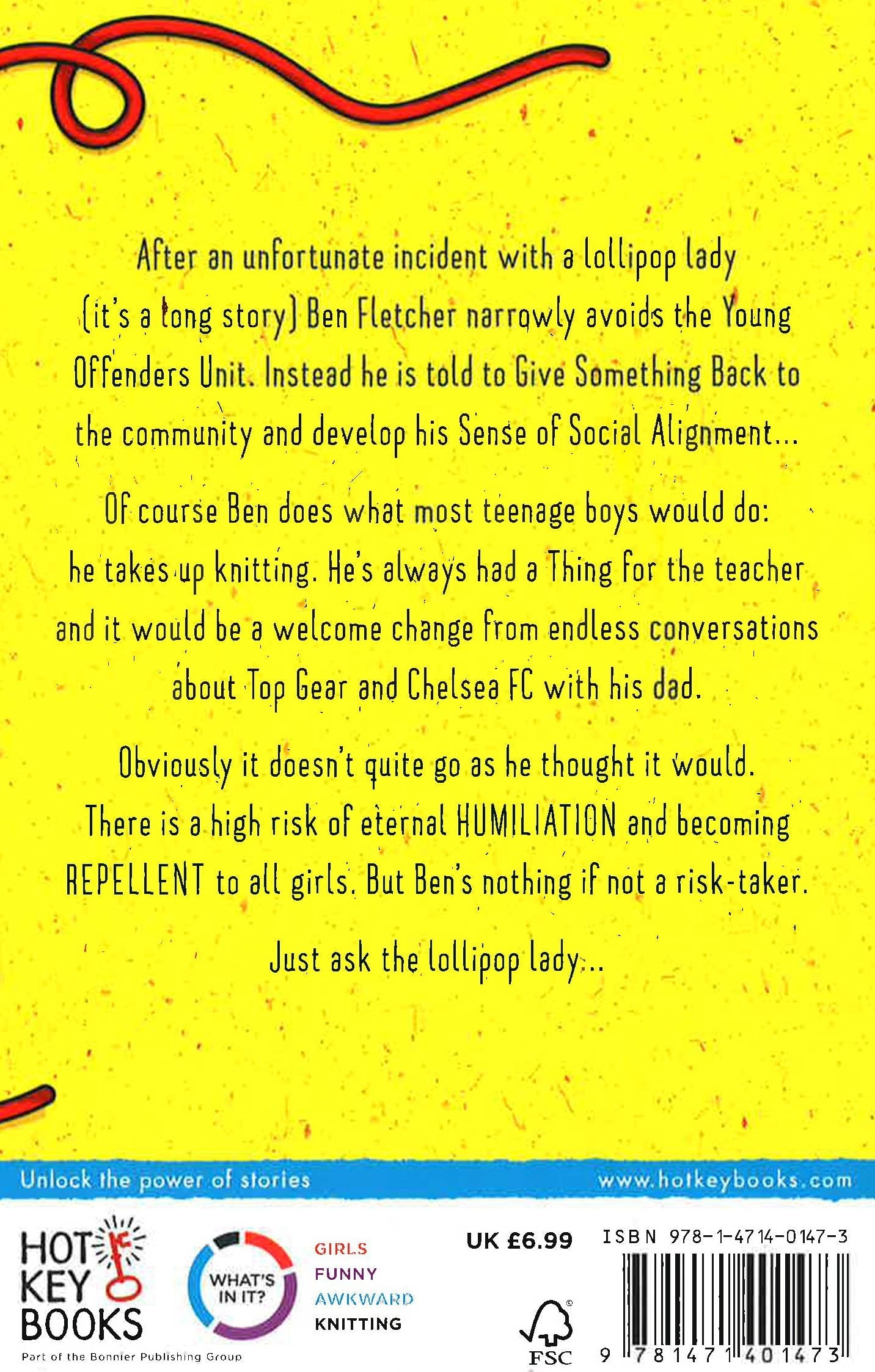 To avoid the Young Offenders unit, Ben is ordered to give something back to the community and develop his sense of social alignment. Take up a hobby and keep on the straight and narrow. The hot teacher he likes runs a knitting group so Ben, reluctantly at first, gets 'stuck in'. Not easy when your dad is a sports fan and thinks Jeremy Clarkson is God. To his surprise, Ben finds that he likes knitting and that he has a mean competitive streak. If he can just keep it all a secret from his mates...and notice that the girl of his dreams, girl-next-door Megan Hooper has a bit of a thing for him...