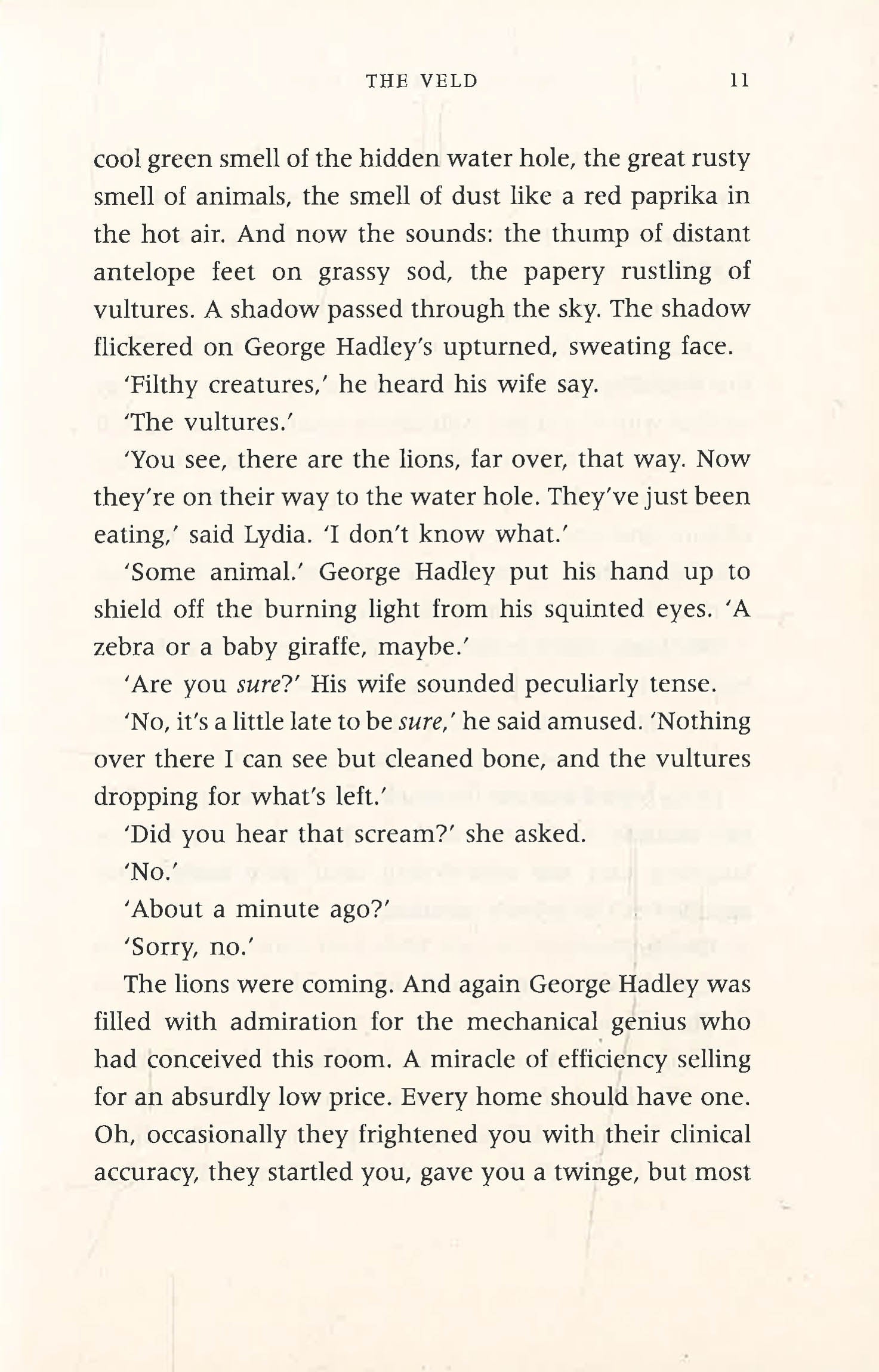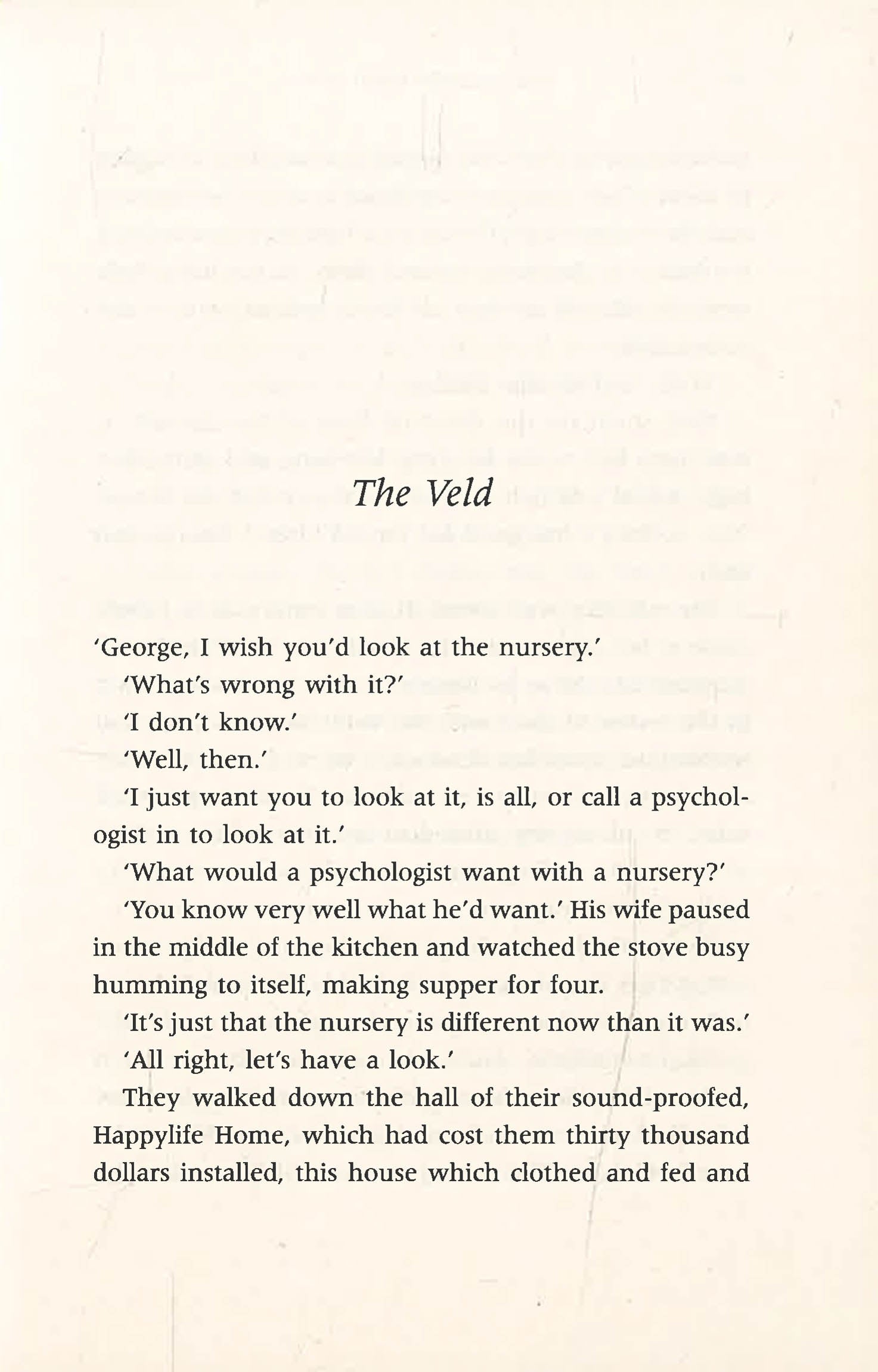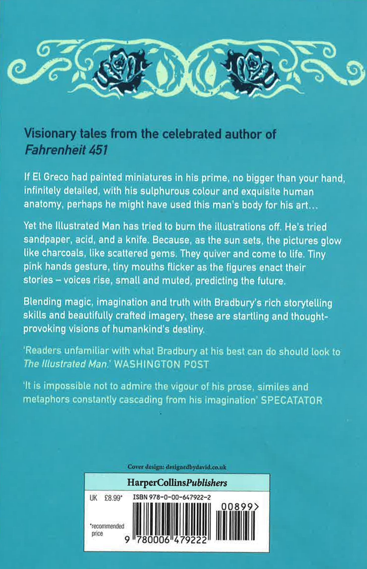 Yet the Illustrated Man has tried to burn the illustrations off. He's tried sandpaper, acid, and a knife. Because, as the sun sets, the pictures glow like charcoals, like scattered gems. They quiver and come to life. Tiny pink hands gesture, tiny mouths flicker as the figures enact their stories - voices rise, small and muted, predicting the future.