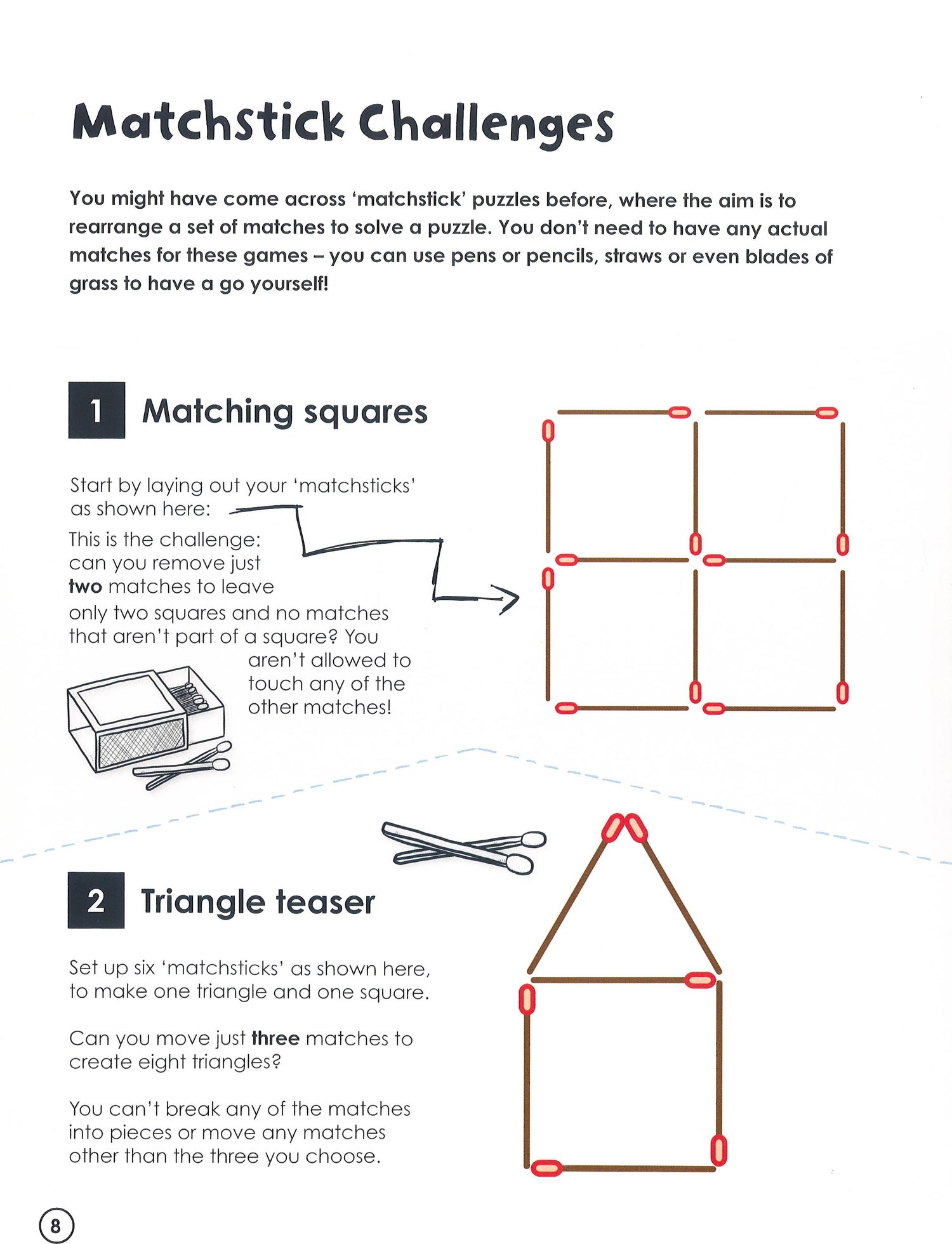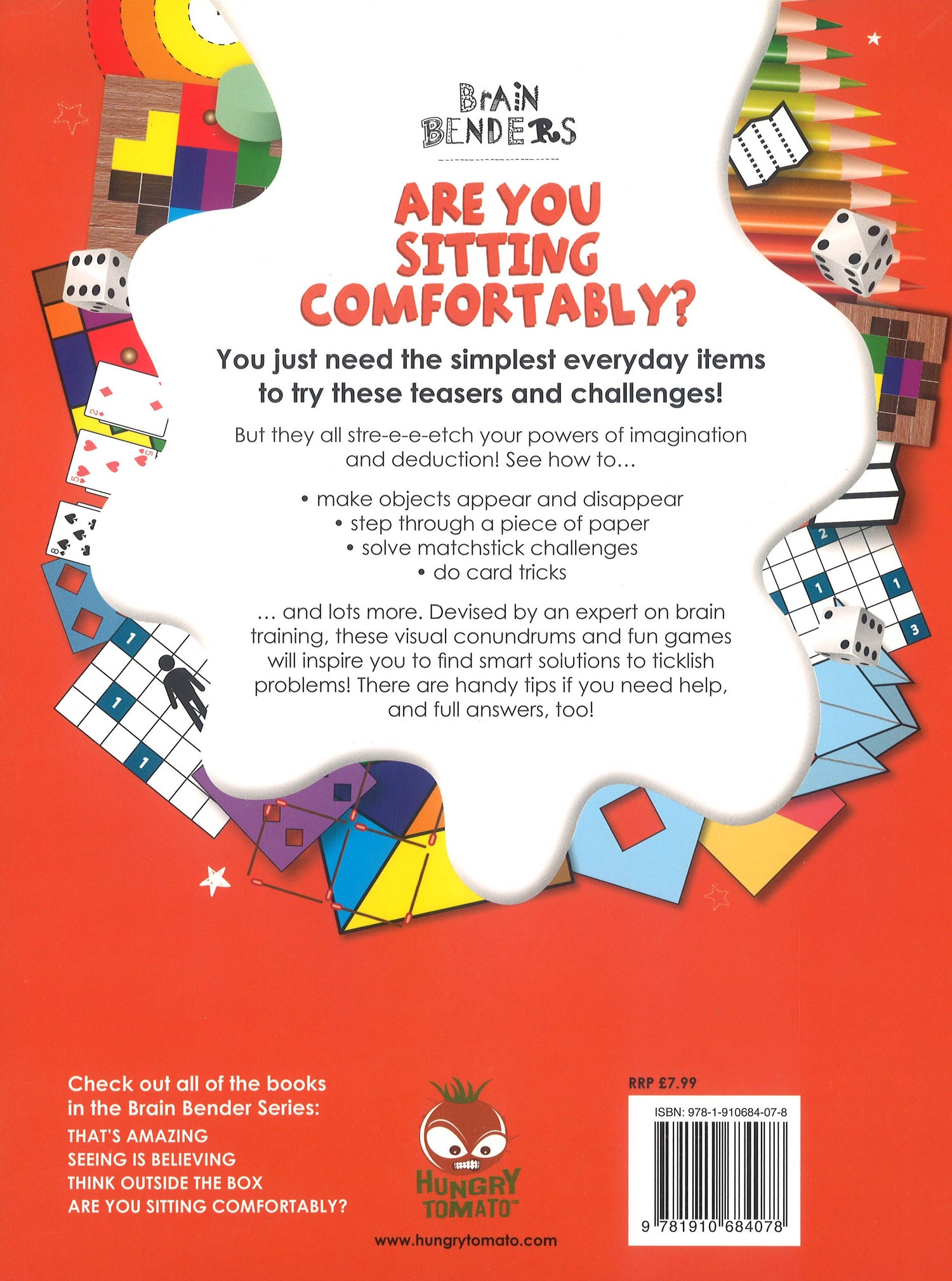 You just need the simplest everyday items to try these teasers and challenges But they all stre-e-e-etch your powers of imagination and deduction See how to... make objects appear and disappear step through a piece of paper solve matchstick challenges do card tricks ...and lots more. Devised by an expert on brain training these visual conundrums and fun games will inspire you to find smart solutions to ticklish problems There are handy tips if you need help and full answers too.