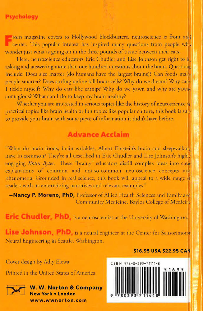 Neuroscience in small bits for the brain-curious.From magazine covers to Hollywood blockbusters, neuroscience is front and centre. This popular interest has inspired many questions from people who wonder just what is going on in the three pounds of tissue between their ears. In Brain Bytes, neuroscience educators Eric Chudler and Lise Johnson get right to it, asking and answering more than one hundred questions about the brain. Questions include: Does size matter (do humans have the largest brains)? Can foods make people smarter? Does surfing online kill brain cells? Why do we dream? Why can't I tickle myself? Why do cats like catnip? Why do we yawn and why are yawns contagious? What can I do to keep my brain healthy? Whether you are interested in serious topics like the history of neuroscience or practical topics like brain health or fun topics like popular culture, this book is sure to provide your brain with some piece of information it didn't have before.