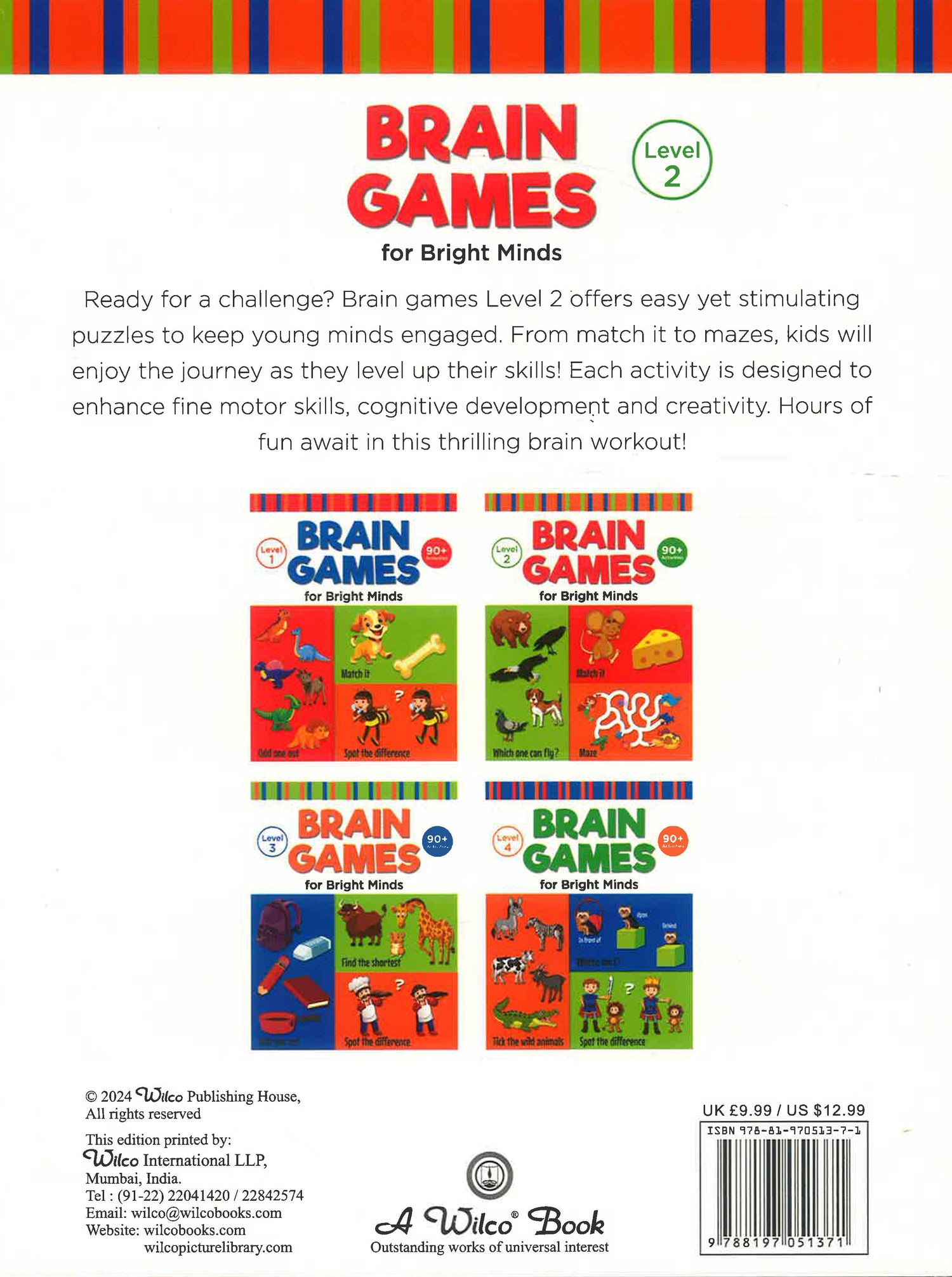 Ready for a challenge? Brain games Level 2 offers easy yet stimulating puzzles to keep young minds engaged From match it to mazes, kids will enjoy the journey as they level up their skills! Each activity is designed to enhance fine motor skills, cognitive development and creativity Hours of fun await in this thrilling brain workout!