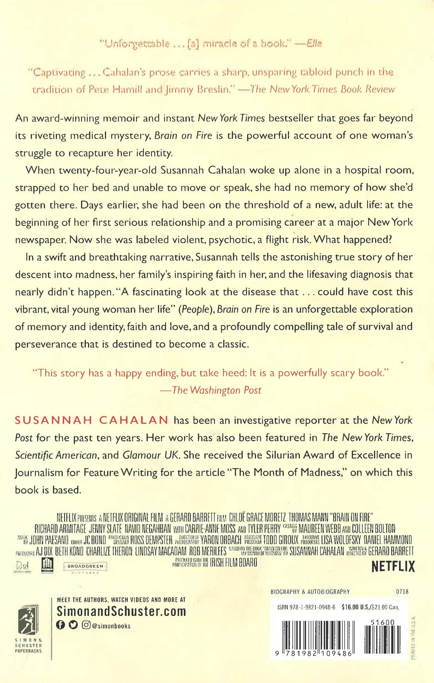 An award-winning memoir and instant New York Times bestseller that goes far beyond its riveting medical mystery, Brain on Fire is the powerful account of one woman’s struggle to recapture her identity. When twenty-four-year-old Susannah Cahalan woke up alone in a hospital room, strapped to her bed and unable to move or speak, she had no memory of how she’d gotten there. Days earlier, she had been on the threshold of a new, adult life: at the beginning of her first serious relationship and a promising career at a major New York newspaper. Now she was labeled violent, psychotic, a flight risk. What happened? In a swift and breathtaking narrative, Susannah tells the astonishing true story of her descent into madness, her family’s inspiring faith in her, and the lifesaving diagnosis that nearly didn’t happen. “A fascinating look at the disease that…could have cost this vibrant, vital young woman her life” (People), Brain on Fire is an unforgettable exploration of memory and identity, faith and love, and a profoundly compelling tale of survival and perseverance that is destined to become a classic.