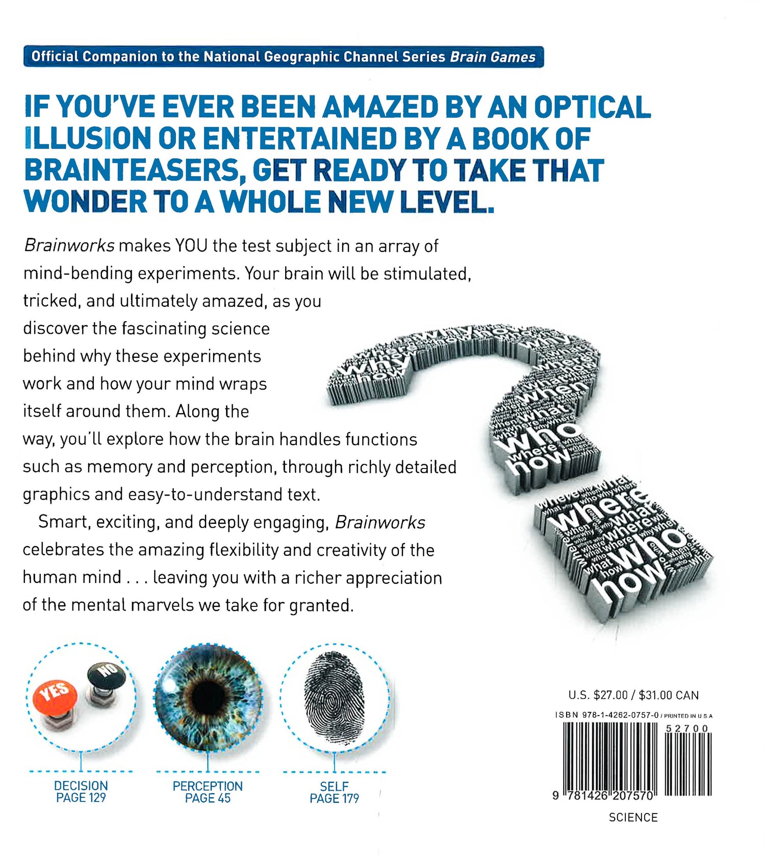 In three sections―”Seeing,” “Thinking,” and “Being”―you’ll see for yourself why these visual illusions and experiments hoodwink the brain. You’ll find out how the structure of the eye influences what you see. And you’ll think of events that may not have actually happened, in order to learn how the mind can create a false memory. Rather than simply displaying a collection of puzzlers or visual illusions, each chapter guides you through a series of perceptual and thought experiments firsthand and then walks you through your brain’s reaction in clear, user-friendly language―providing every reader with a compelling personal interest in finding out why his or her mind acts the way it does. Smart, exciting, and deeply engaging, Brainworks pulls you in, manipulates your mind, and leaves you with a better understanding―as well as a richer appreciation―of the mental marvels that we take for granted.