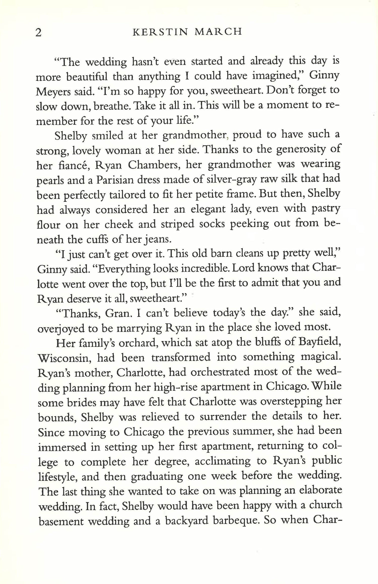 Marriage marks both a happy ending and a new chapter for Shelby Meyers. She and Ryan Chambers have overcome tremendous odds to stand together in her grandparents' orchard on the bluffs of Lake Superior, exchanging vows. Still, there are challenges old and new to contend with. Shelby struggles to find her niche among Ryan’s prominent Chicago family, while her own mother remains unreliable and unpredictable, impacting her life even from afar.Though Shelby’s love for Ryan is as deep-rooted as the orchard, her rocky upbringing makes her hesitant to start a family. Before she can reconcile those feelings, a personal tragedy throws Shelby’s confidence, and her marriage, into crisis. To move forward she’ll have to go back - to her Great Lakes hometown and her mother, and to secrets she could never have guessed at, as she resolves to branch out on her own…