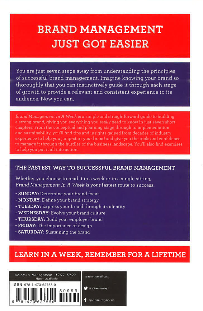 Brand management just got easier Successful brands provide meaning: a higher purpose, a vision of a better future, a code of values, and a culture that drives performance. Brands with meaning stand out in their marketplace and attract like-minded people: customers, employees, suppliers and investors. Successful brand management clearly differentiates organizations, products and services from their competitors and inspires advocacy from all stakeholders. Building a strong brand takes much more than a week: it requires an on-going commitment to excellence. This updated second edition of Brand Management In A Week provides a proven seven-day program on the principles of brand management. It takes you from the conceptual and planning stage through to implementation and sustainability. It's packed with tips and insights gained from decades of industry experience to help you jump-start your brand and give you the tools and confidence to manage it through the hurdles of the business landscape. Each of the seven chapters in Brand Management In A Week covers a different aspect: - Sunday: Determine your brand focus - Monday: Define your brand strategy - Tuesday: Express your brand through its identity - Wednesday: Evolve your brand culture - Thursday: Build your employer brand - Friday: The importance of design - Saturday: Sustaining the brand