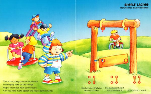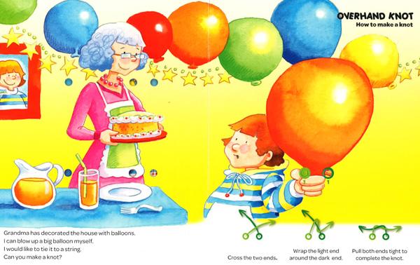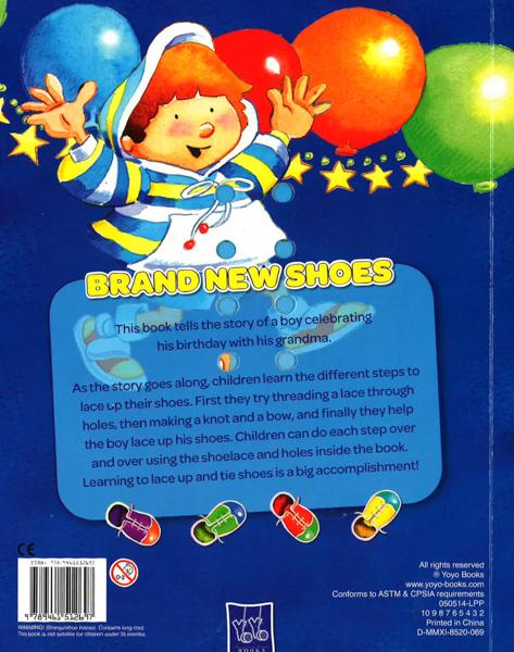 A little boy celebrates his birthday with his grandma and she gives him a gift of new shoes, in a board book that includes laces for tying. (Age Range 3-7)