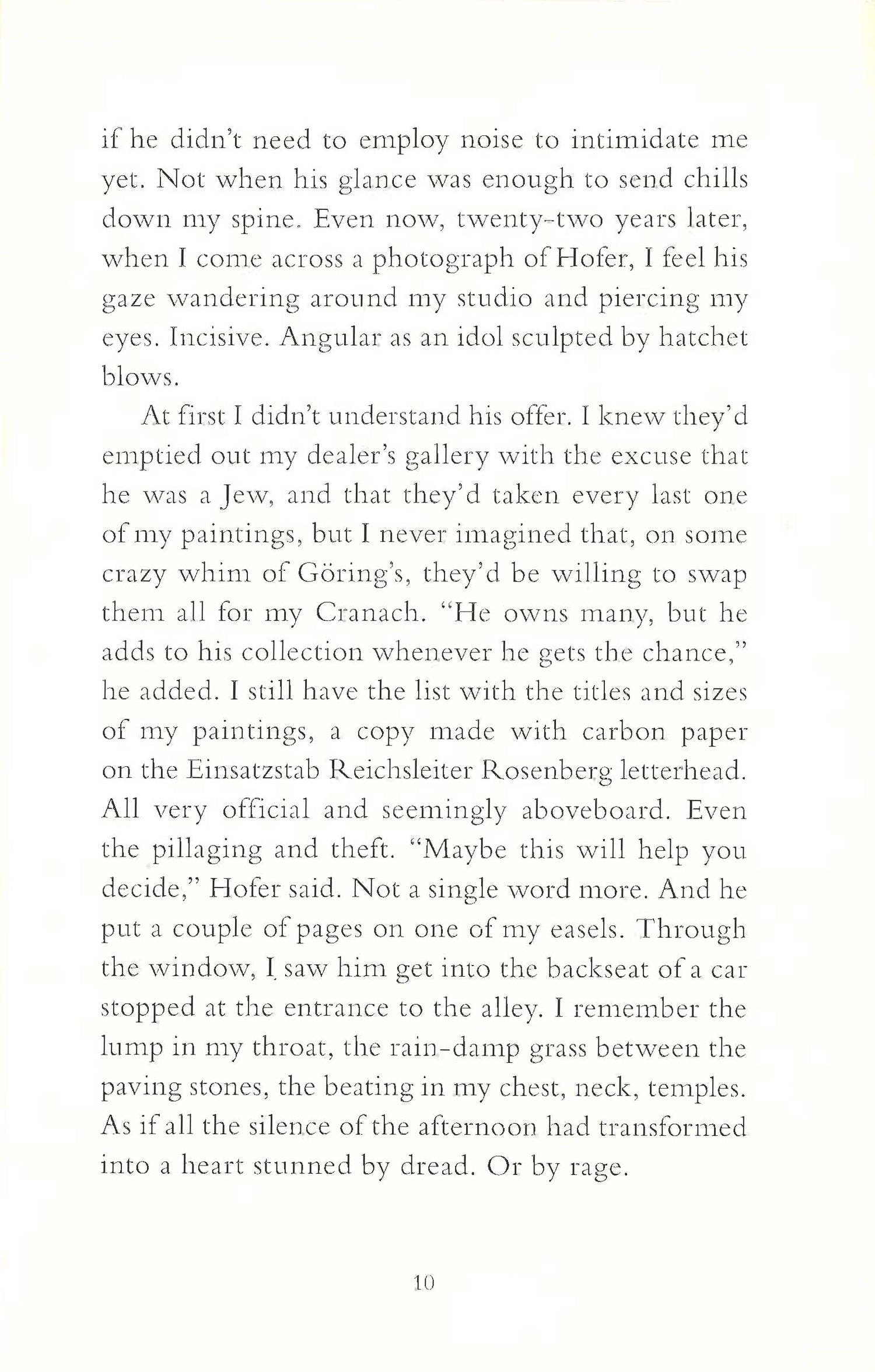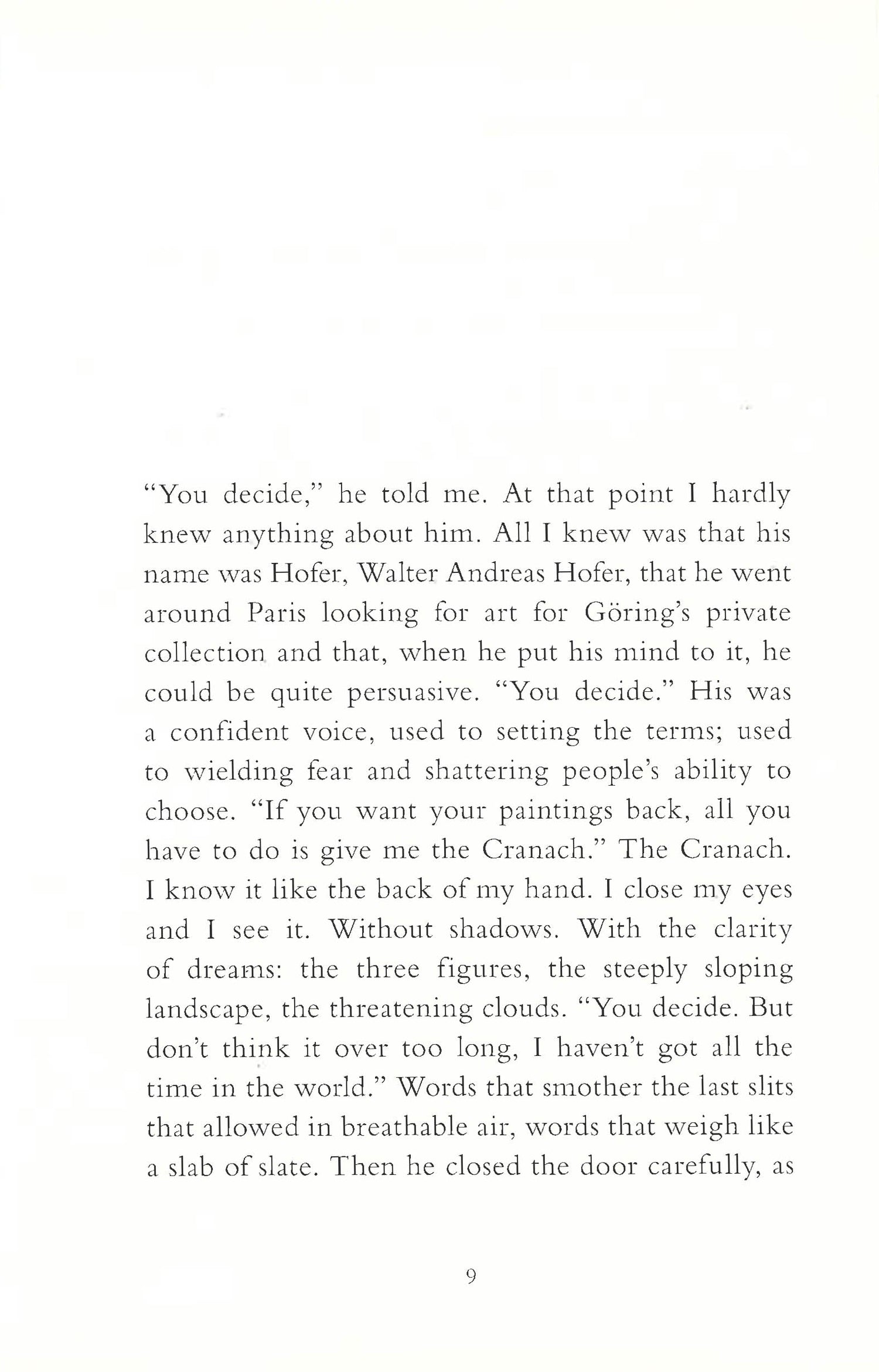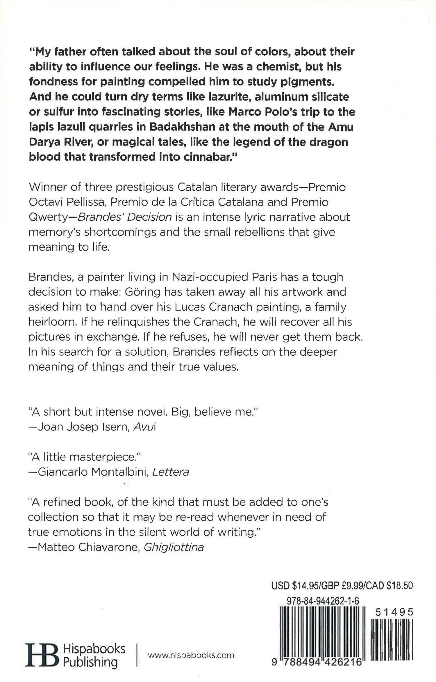 "A short but intense novel. Big, believe me."--Joan Josep Isern, Avui "A little masterpiece."--Giancarlo Montalbini, Lettera "A refined book. One of those books one should add to one's book collection, that one should re-read when looking for emotions in the silent world of writing."--Matteo Chiavarone, Ghigliottina Brandes, a painter living in the Nazi-occupied Paris, will have to make a tough decision: Goering has taken away all his work and asked him to hand him over his Lucas Cranach painting, a family relic. If he does so, he will retrieve them, if he refuses to do it, he will never get them back.