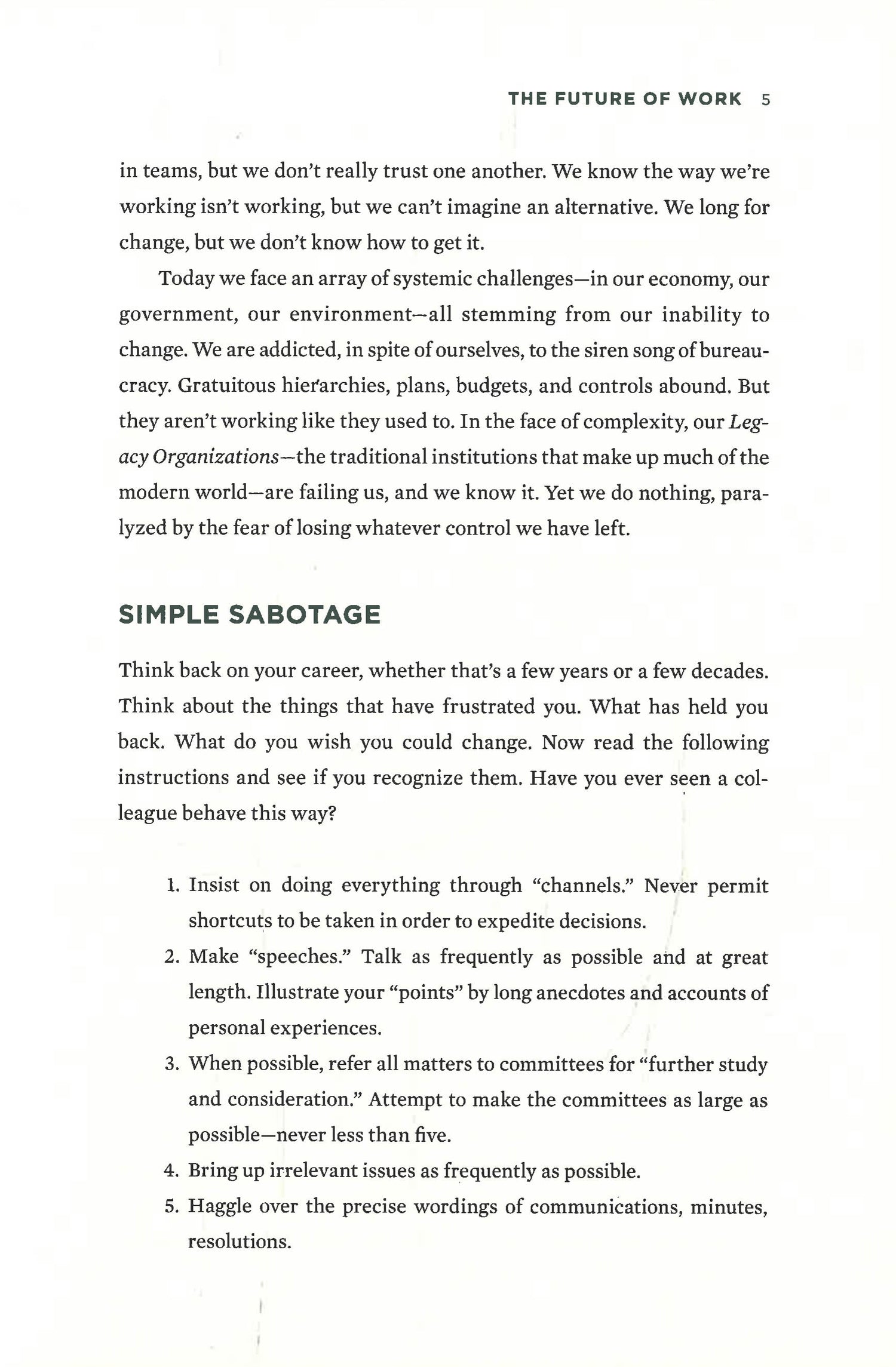 He’s found that nearly everyone, from Wall Street to Silicon Valley, points to the same frustrations: lack of trust, bottlenecks in decision making, siloed functions and teams, meeting and email overload, tiresome budgeting, short-term thinking, and more.