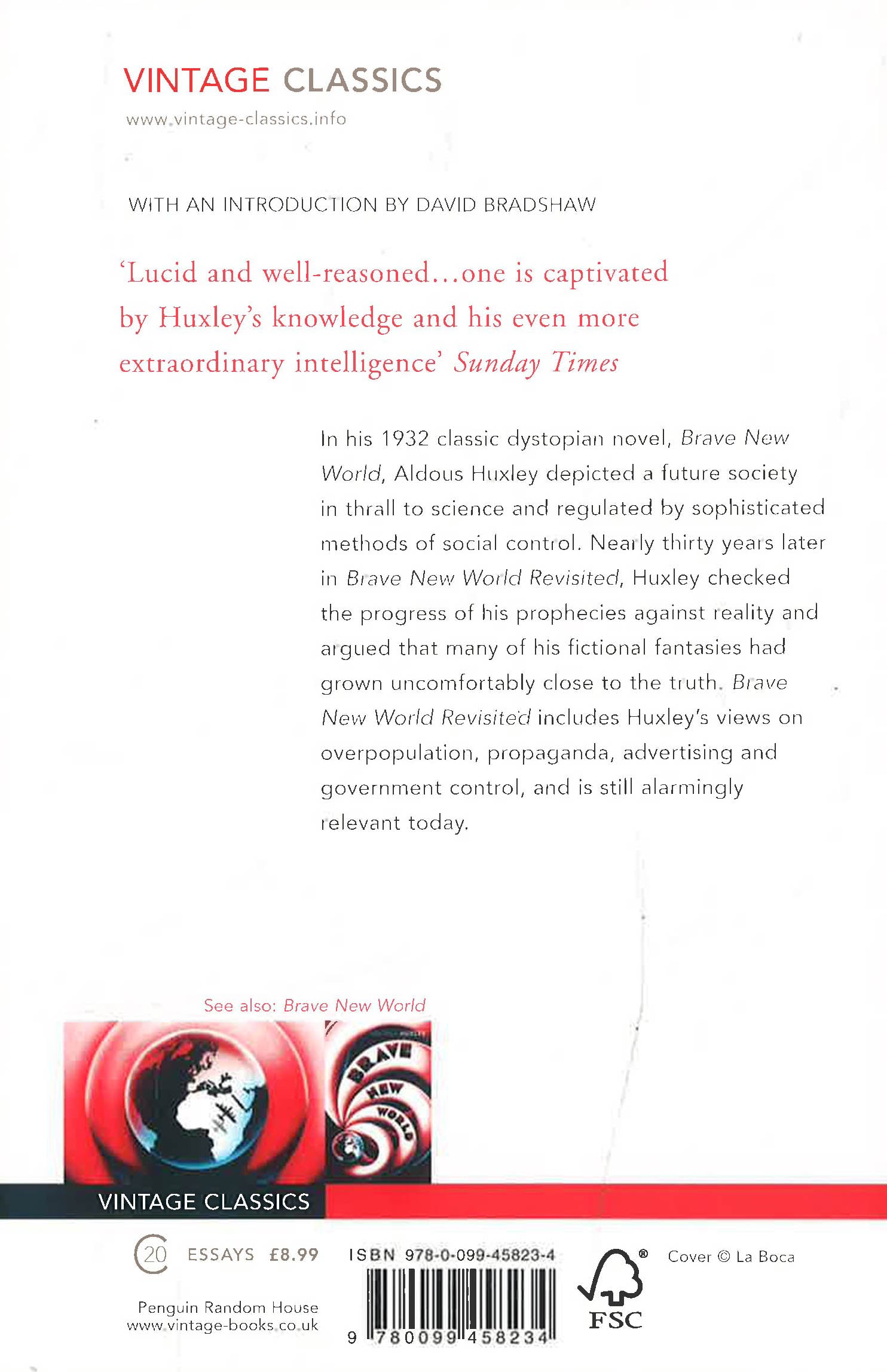 In his 1932 classic dystopian novel, Brave New World, Aldous Huxley depicted a future society in thrall to science and regulated by sophisticated methods of social control. Nearly thirty years later in Brave New World Revisited, Huxley checked the progress of his prophecies against reality and argued that many of his fictional fantasies had grown uncomfortably close to the truth. Brave New World Revisited includes Huxley's views on overpopulation, propaganda, advertising and government control, and is an urgent and powerful appeal for the defence of individualism still alarmingly relevant today.