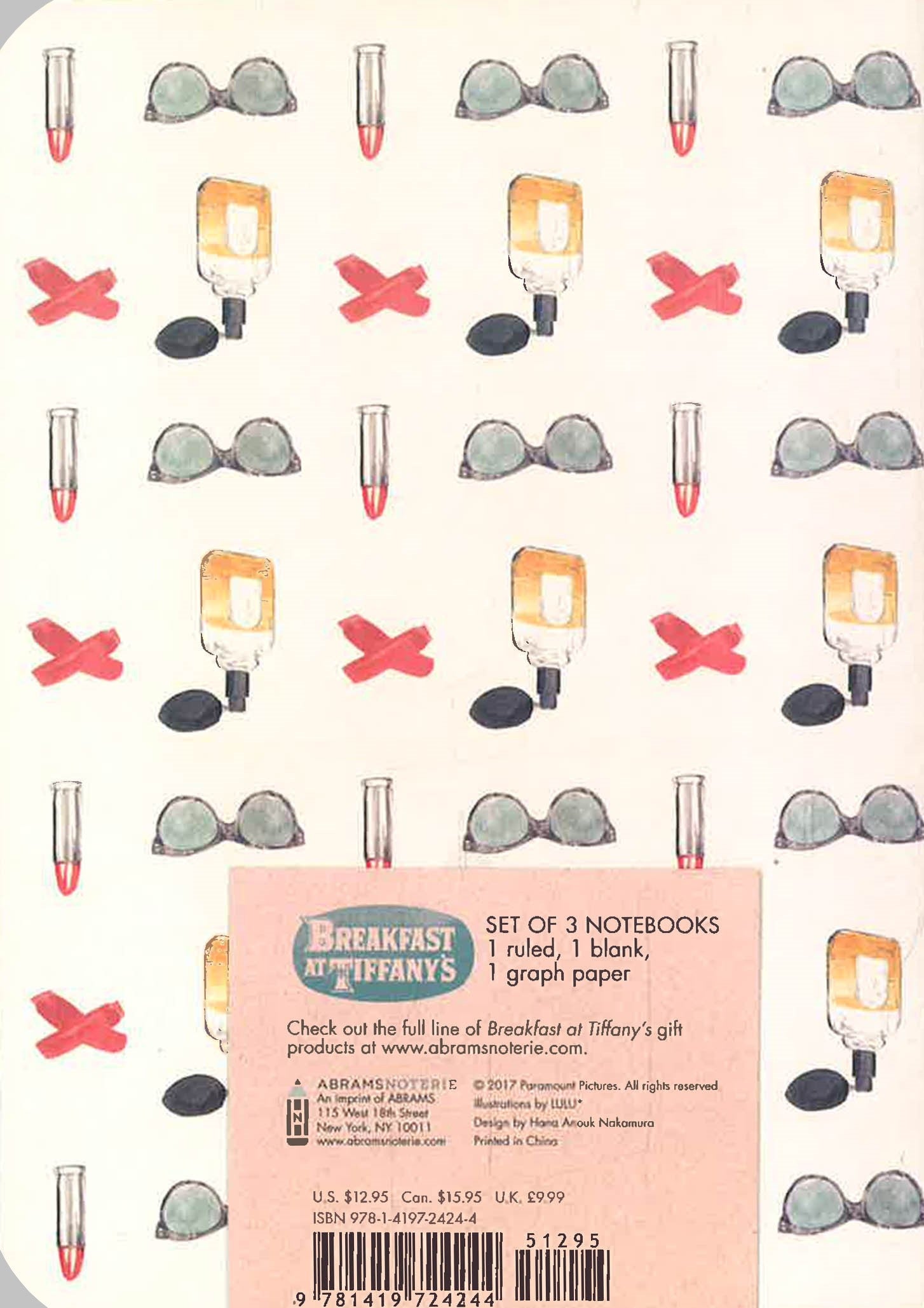 Inspired by the beloved character Holly Golightly from the classic film, Breakfast at Tiffany?s, this stylish set of three paperback notebooks is perfect for tossing in your bag, making lists, and dashing down thoughts on the fly. Each notebook cover features different illustrations of the movie?s most popular icons: Holly?s sequined sleep mask, her cat eye sunglasses, her lipstick, and more. The set includes two larger notebooks, one lined and the other blank, and a small notebook with a graph paper interior.
