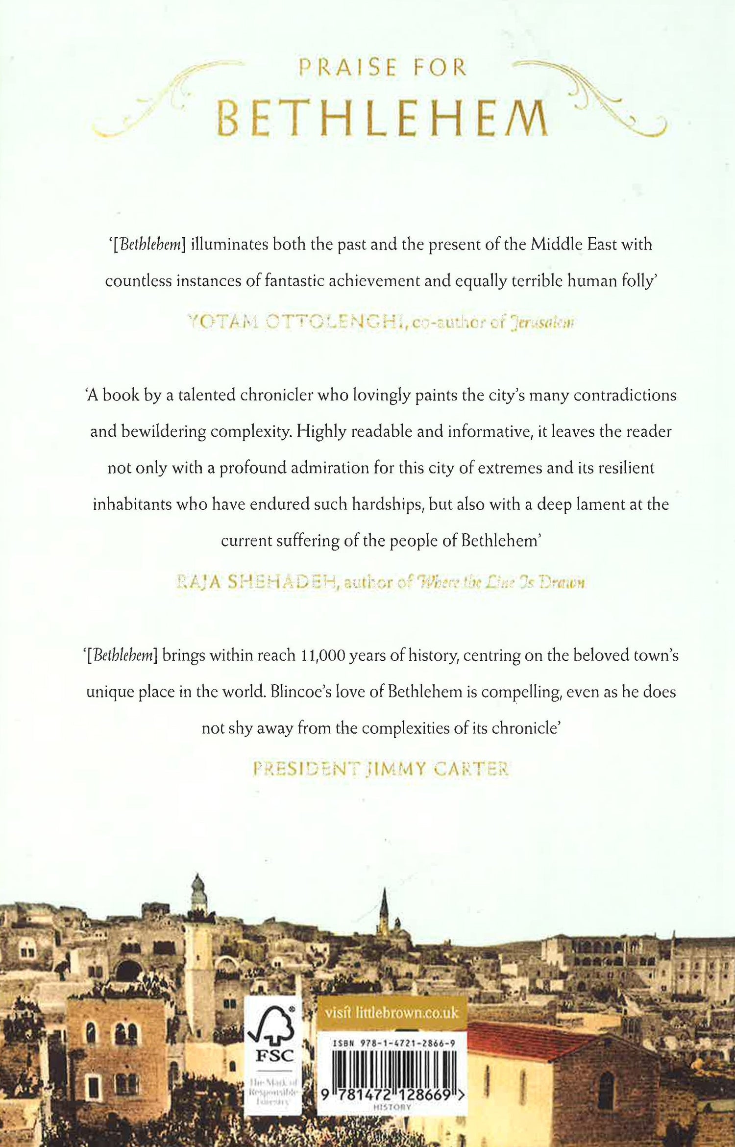 The town of Bethlehem carries so many layers of meaning--some ancient, some mythical, some religious--that it feels like an unreal city, even to the people who call it home. Today, the city is hemmed in by a wall and surrounded by forty-one Israeli settlements and hostile settlers and soldiers. The population is undergoing such enormous strains it is close to falling apart. Any town with an eleven-thousand-year history has to be robust, but Bethlehem may soon go the way of Salonica or Constantinople: the physical site might survive, but the long thread winding back to the ancient past will have snapped, and the city risks losing everything that makes it unique. Still, for many, Bethlehem remains the "little town" of the Christmas song. Nicholas Blincoe will tell the history of the famous little town, through the visceral experience of living there, taking readers through its stone streets and desert wadis, its monasteries, aqueducts and orchards, showing the city from every angle and era. Inevitably, a portrait of Bethlehem will shed light on one of the world's most intractable political problems. Bethlehem is a much-loved Palestinian city, a source of pride and wealth but also a beacon of co-existence in a region where hopelessness, poverty and violence has become the norm. Bethlehem could light the way to a better future, but if the city is lost then the chances of an end to the Israel-Palestine conflict will be lost with it.