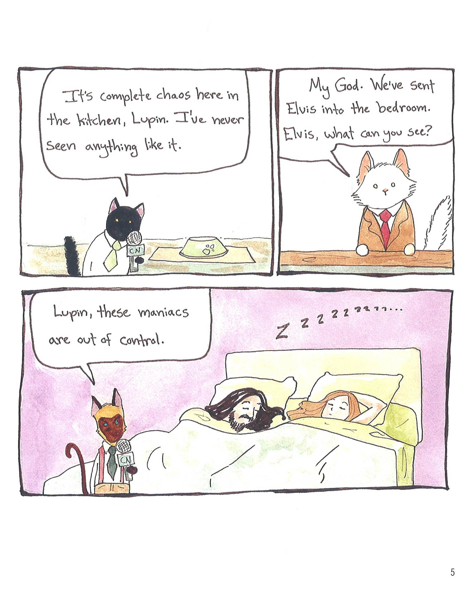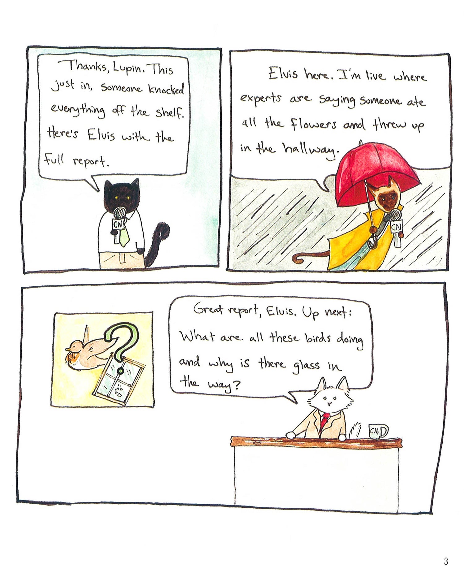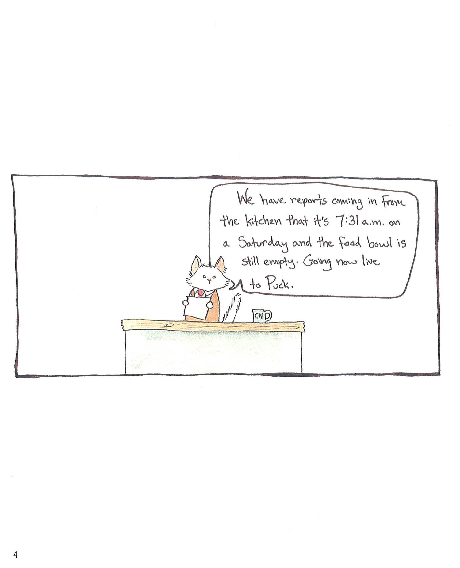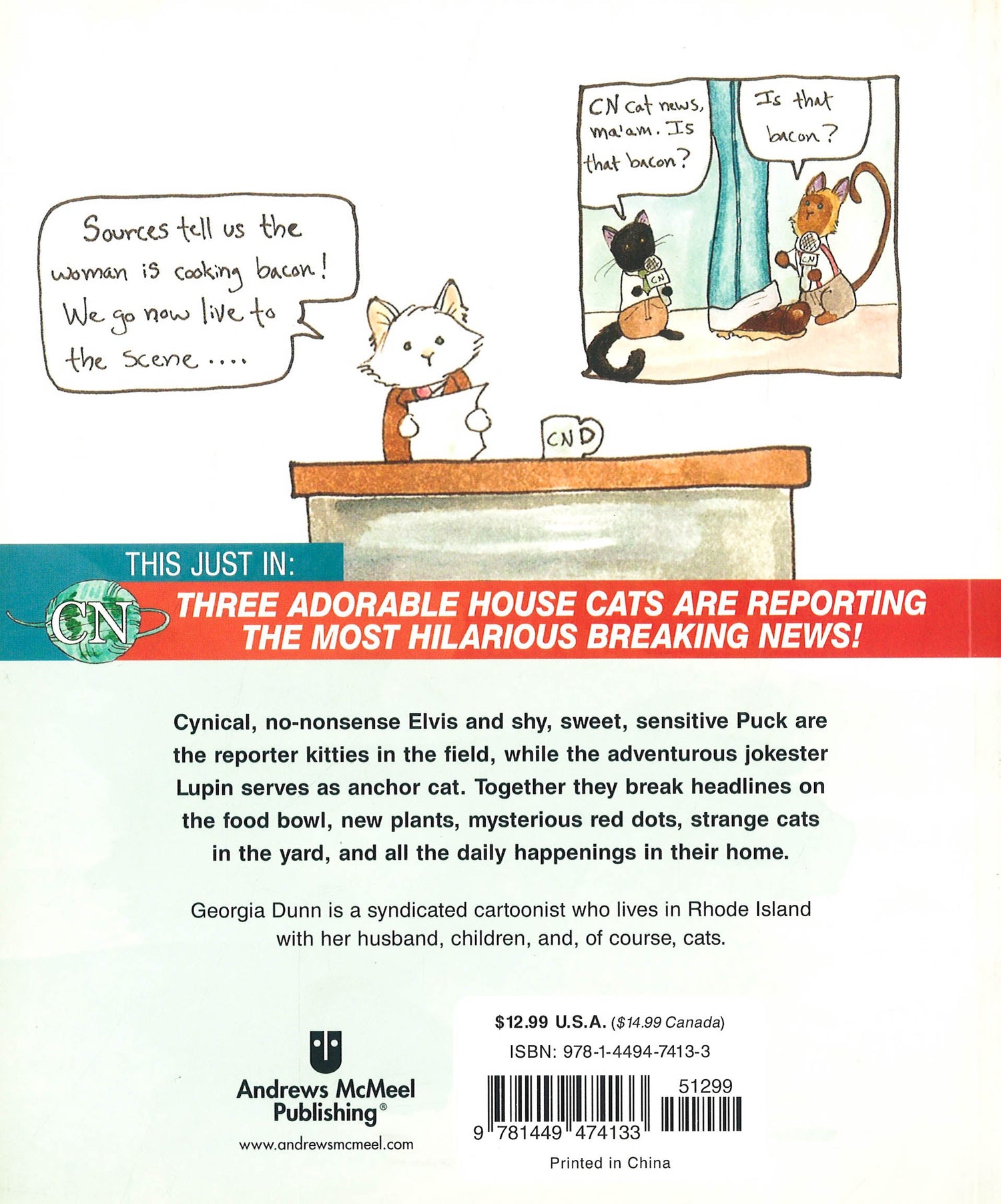 Based on author/illustrator Georgia Dunn's real life pets, Elvis, Lupin, and Puck strap on neckties and pick up microphones to provide the most up-to-date relevant news stories (at least according to them). Cats reporting on the news that matters to cats with stories such as The Vacuum Cleaner Is Back!, The Woman Is Cooking Bacon!, and The Ceiling Cats Are Everywhere Tonight! Cynical, no nonsense Elvis and shy, sweet, sensitive Puck are the reporter kitties in the field, while the adventurous jokester Lupin serves as anchor cat. Together they break headlines on the food bowl, new plants, mysterious red dots, strange cats in the yard, and all the daily happenings in their home.