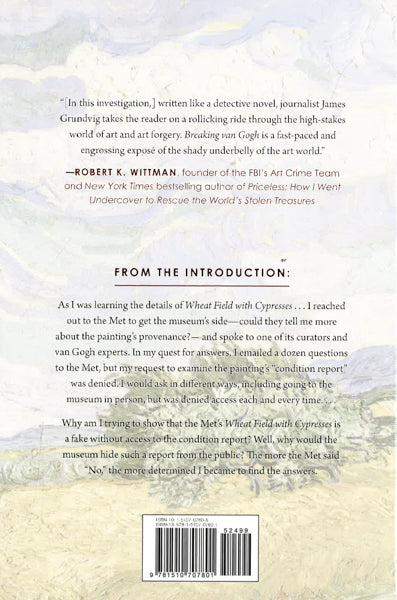 In Breaking van Gogh, James Grundvig investigates the history and authenticity of van Gogh's iconic Wheat Field with Cypresses, currently on display at the Metropolitan Museum of Art in New York. Relying on a vast array of techniques from the study of the painter's biography and personal correspondence to the examination of the painting's style and technical characteristics, Grundvig proves that "the most expensive purchase" housed in the Met is a fake.