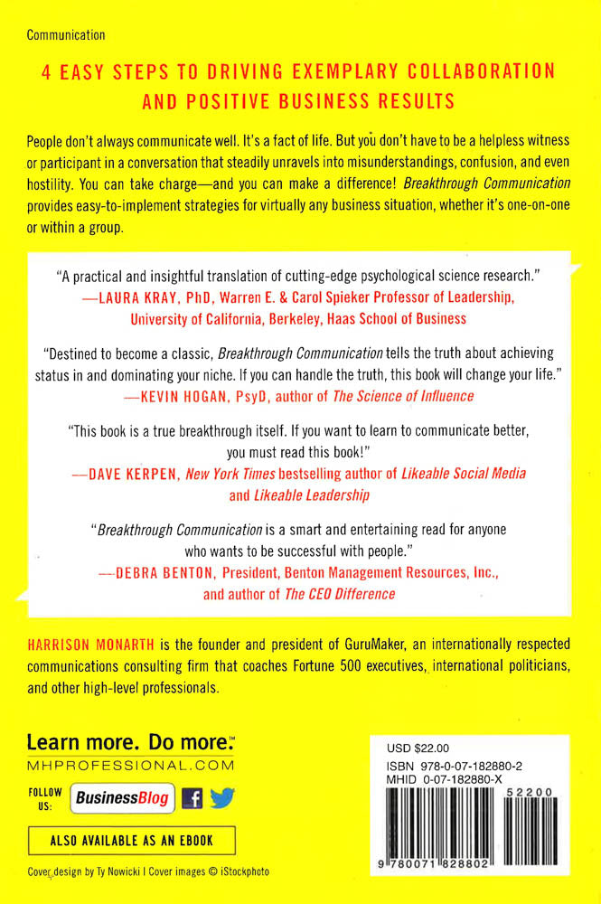 4 EASY STEPS TO DRIVING EXEMPLARY COLLABORATION AND POSITIVE BUSINESS RESULTSPeople don't always communicate well. It's a fact of life. But you don't have to be a helpless witness or participant in a conversation that steadily unravels into misunderstandings, confusion, and even hostility. You can take charge--and you can make a difference! Breakthrough Communication provides easy-to-implement strategies for virtually any business situation, whether it's one-on-one or within a group."Not since Dale Carnegie's How to Win Friends and Influence People has there been such a valuable roadmap for bringing high-impact results." -- Marshall Goldsmith, New York Times bestselling author of What Got You Here Won't Get You There and MOJO"A practical and insightful translation of cutting-edge psychological science research." -- Laura Kray, PhD, Warren E. & Carol Spieker Professor of Leadership,University of California, Berkeley, Haas School of Business"Destined to become a classic, Breakthrough Communication tells the truth about achieving status in and dominating your niche. If you can handle the truth, this book will change your life." -- Kevin Hogan, PsyD, author of The Science of Influence"This book is a true breakthrough itself. If you want to learn to communicate better, you must read this book!" -- Dave Kerpen, New York Times bestselling author of Likeable Social Media and Likeable Leadership"Breakthrough Communication is a smart and entertaining read for anyone who wants to be successful with people." -- Debra Benton, President, Benton Management Resources, Inc., and author of The CEO Difference
