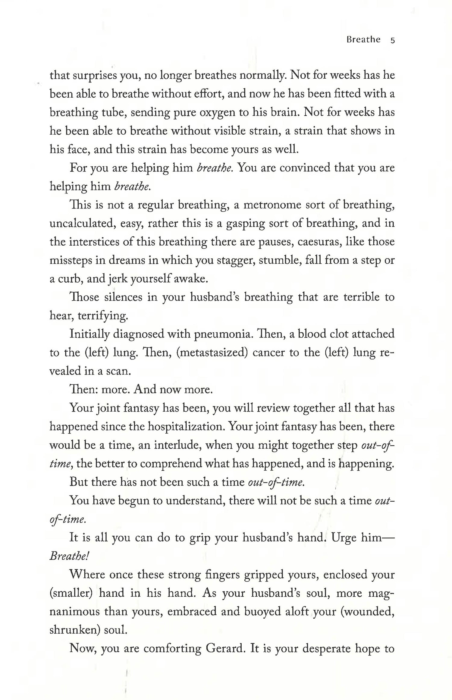 Part intimately detailed love story, part horror story rooted in real life, BREATHE is an exploration of hauntedness rooted in the domesticity of marital love, as well as our determination both to be faithful to the beloved and to survive the trauma of loss.