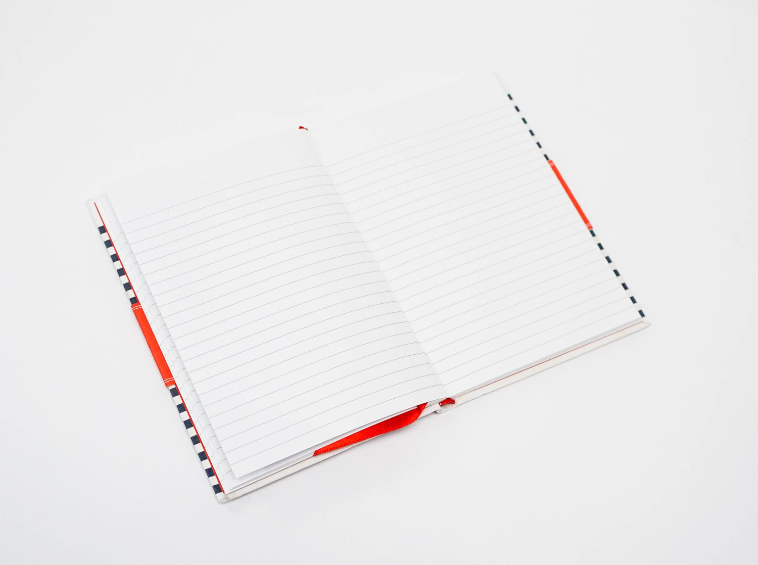 This fashionable notebook is adorned with Breton stripes in black. With a real cloth cover and beautiful contrasting ribbon marker, this notebook is a must have accessory. The Breton stripes Notebook is also available in Sunny Yellow, Hot Pink and Sky Blue. Originally worn by French Sailors, Breton stripes are now worn by people of all ages, genders and nationalities. This timeless fashion staplenow adorns our notebooks to make the perfect accessory.