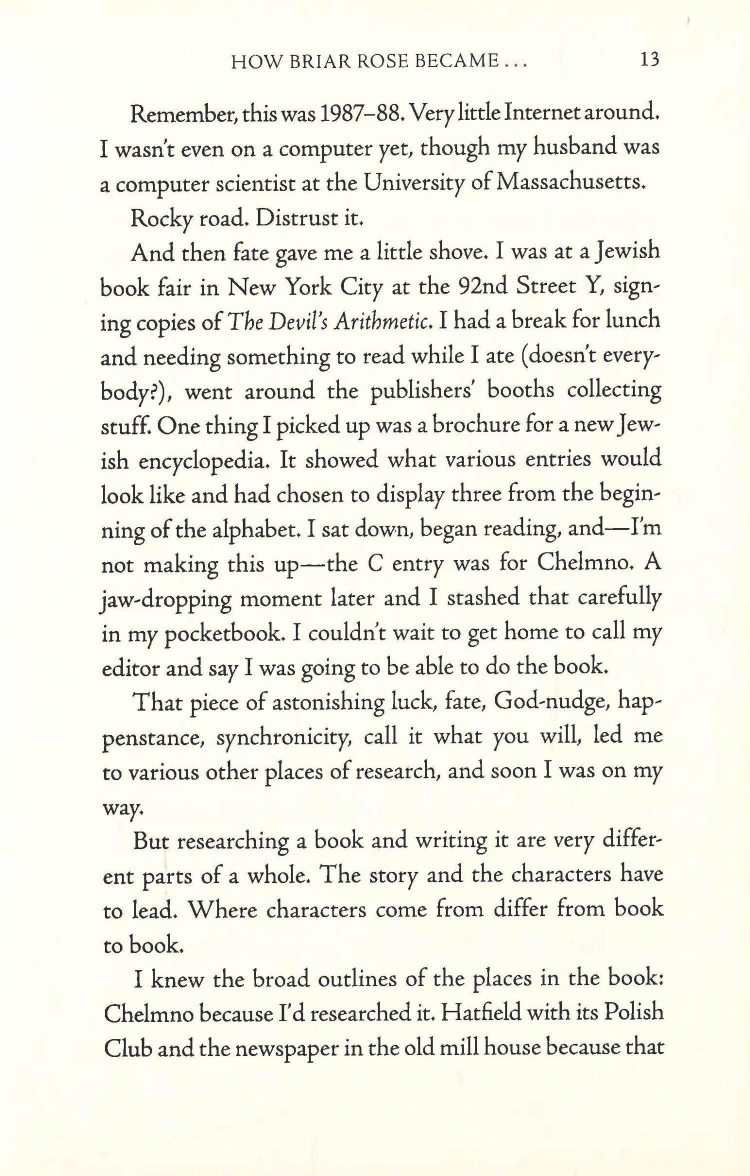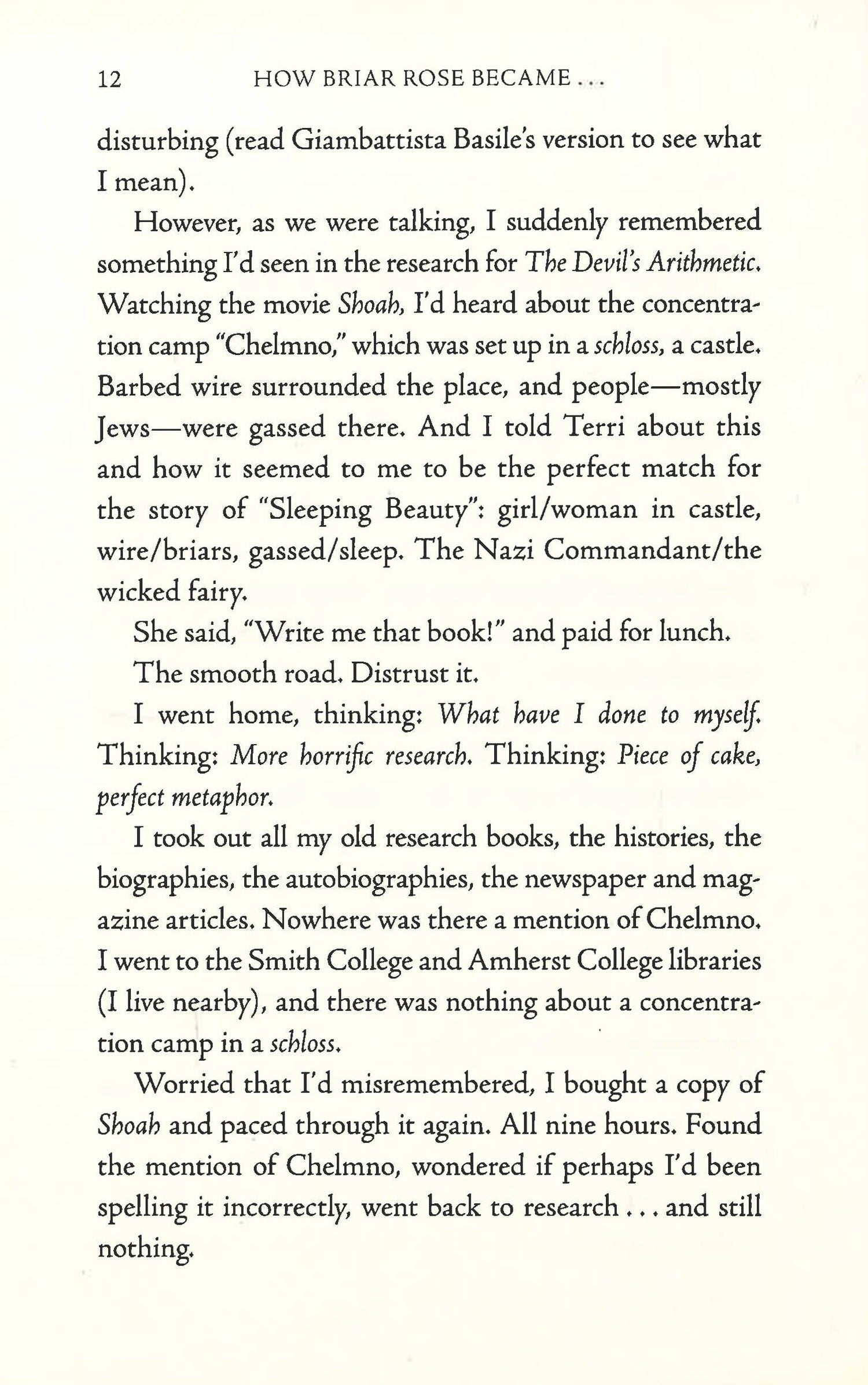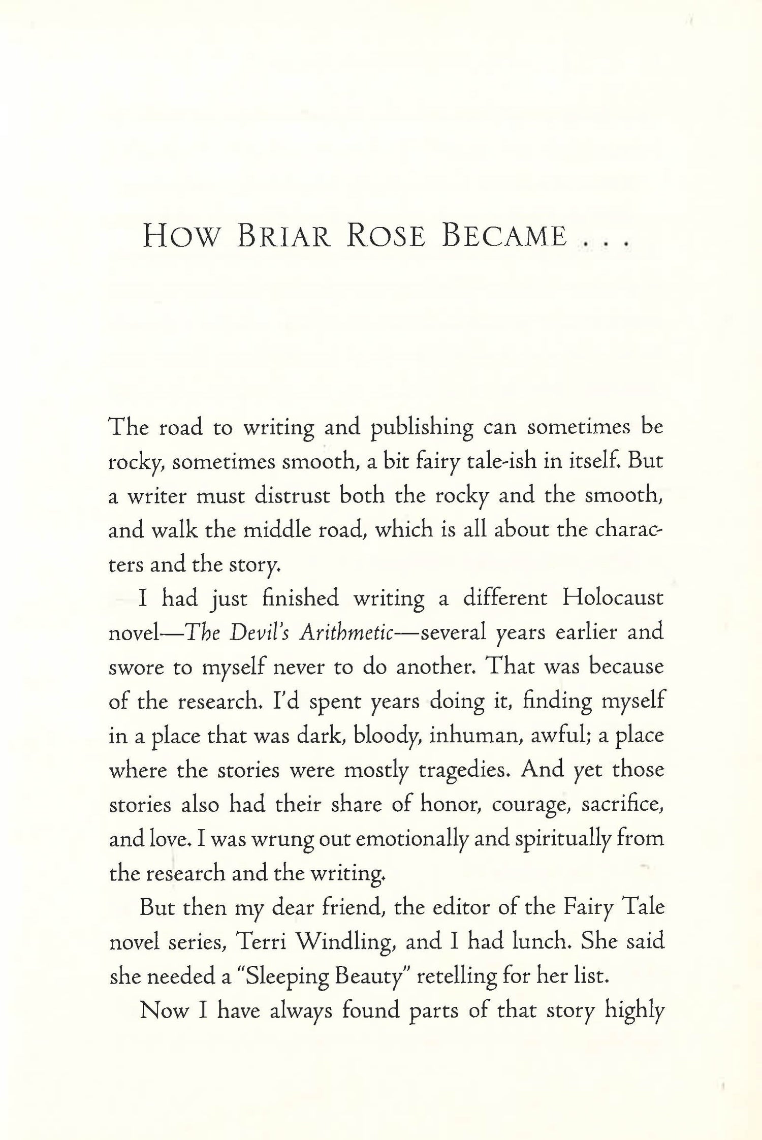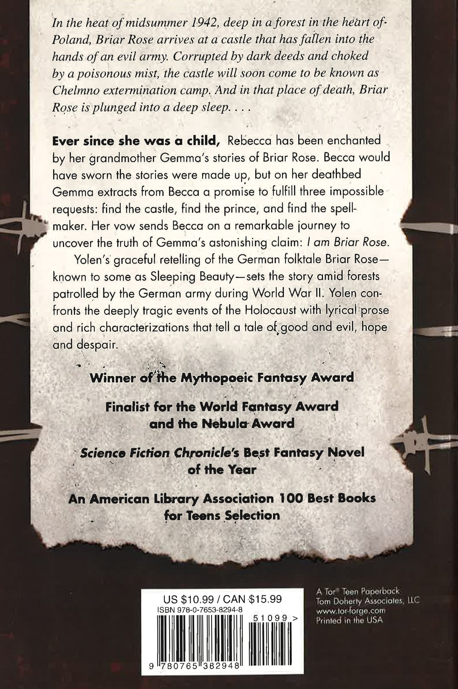 Briar Rose is a historically sensitive retelling of Sleeping Beauty set amid forests patrolled by the German army during World War II.In the heat of midsummer 1942, deep in a forest in the heart of Poland, Briar Rose arrives at a castle that has fallen into the hands of an evil army. Corrupted by dark deeds and choked by a poisonous mist, the castle will soon come to be known as Chelmno extermination camp. And in that place of death, Briar Rose is plunged into a deep sleep....Ever since she was a child, Rebecca has been enchanted by her grandmother Gemma's stories of Briar Rose. Becca would have sworn the stories were made up, but on her deathbed Gemma extracts from Becca a promise to fulfill three impossible requests: find the castle, find the prince, and find the spell-maker. Her vow sends Becca on a remarkable journey to uncover the truth of Gemma's astonishing claim: I am Briar Rose.Yolen's graceful retelling of the German folktale of “Briar Rose”—known to some as “Sleeping Beauty”—sets the story amid forests patrolled by the German army during World War II. Yolen confronts the deeply tragic events of the Holocaust with lyrical prose and rich characterizations that tell a tale of good and evil, hope and despair.The Washington Post called Briar Rose “a terrifically moving story.”