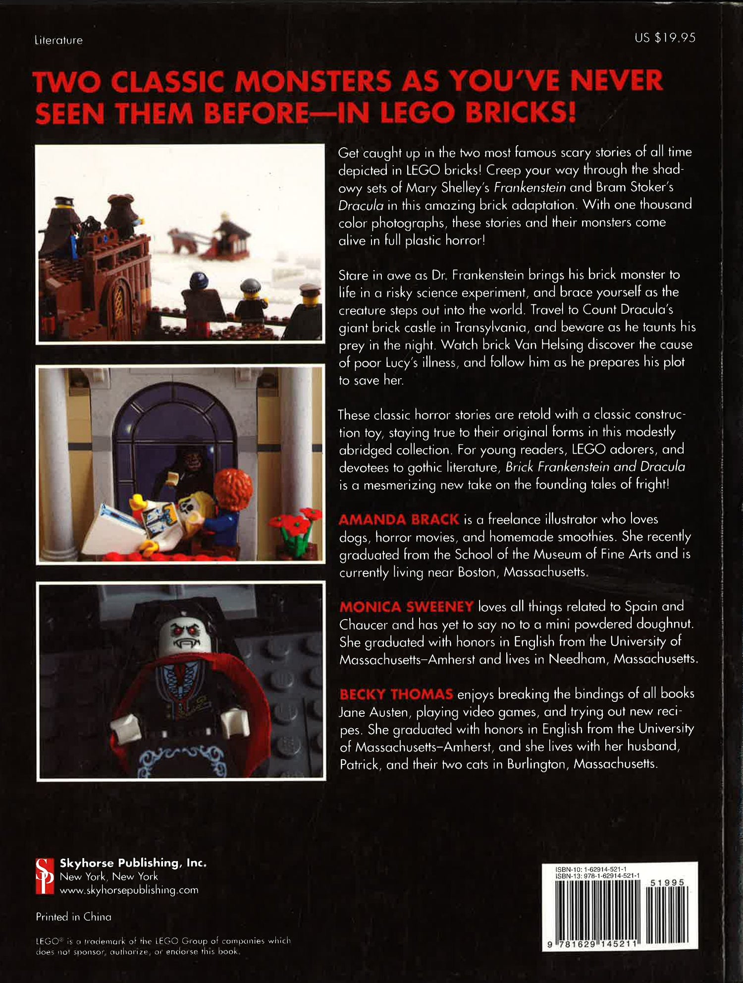 Get caught up in the two most famous scary stories of all time depicted in LEGO bricks! Creep your way through the shadowy sets of Mary Shelley's Frankenstein and Bram Stoker's Dracula in this amazing brick adaptation. With one thousand color photographs, these stories and their monsters come alive in full plastic horror! Stare in awe as Dr. Frankenstein brings his brick monster to life in a risky science experiment, and brace yourself as the creature steps out into the world. Travel to Count Dracula's giant brick castle in Transylvania, and beware as he taunts his prey in the night. Watch brick Van Helsing discover the cause of poor Lucy's illness, and follow him as he prepares his plot to save her. These classic horror stories are retold with a classic construction toy, staying true to their original forms in this modestly abridged collection. For young readers, LEGO adorers, and devotees to gothic literature, Brick Frankenstein and Dracula is a mesmerizing new take to the founding tales of fright! Skyhorse Publishing, as well as our Arcade, Yucca, and Good Books imprints, are proud to publish a broad range of books for readers interested in fiction--novels, novellas, political and medical thrillers, comedy, satire, historical fiction, romance, erotic and love stories, mystery, classic literature, folklore and mythology, literary classics including Shakespeare, Dumas, Wilde, Cather, and much more. While not every title we publish becomes a New York Times bestseller or a national bestseller, we are committed to books on subjects that are sometimes overlooked and to authors whose work might not otherwise find a home.