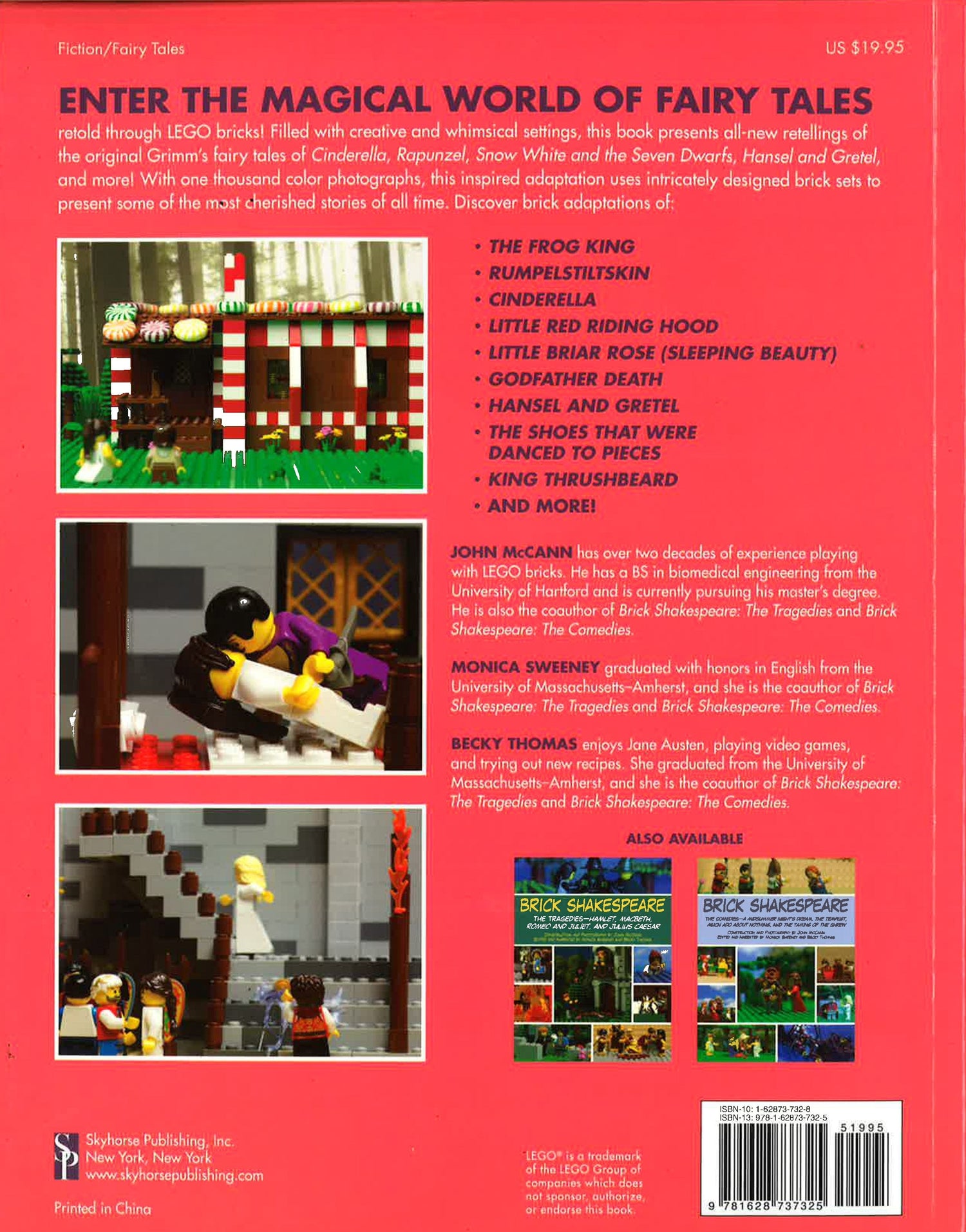 Enter the magical world of fairy tales retold through LEGO bricks! Filled with creative and whimsical settings built from this universally celebrated toy, this book presents an all-new retelling of the original Grimm's fairy tales of Cinderella, Rapunzel, Snow White and the Seven Dwarfs, Hansel and Gretel, and more! With one thousand color photographs, this inspired adaptation uses intricately designed brick sets to present some of the most cherished and widely told stories of all time.Watch the clock strike twelve as Cinderella leaves her glass slipper behind at the ball, and see just how long brick Rapunzel's hair can grow as she waits in her tower. Watch the seven dwarfs plot against the evil Queen and her brick looking glass, and try to find your way home with Hansel's path of brick breadcrumbs.This imaginative take on these age-old fairy tales maintains the authentic text of the Grimm classics but shines a creative new light with fun brick construction! Fairy tales in brick will be a welcome addition to your picture book collection, bringing a creative twist to readers both young and old.Skyhorse Publishing, as well as our Arcade, Yucca, and Good Books imprints, are proud to publish a broad range of books for readers interested in fiction novels, novellas, political and medical thrillers, comedy, satire, historical fiction, romance, erotic and love stories, mystery, classic literature, folklore and mythology, literary classics including Shakespeare, Dumas, Wilde, Cather, and much more. While not every title we publish becomes a New York Times bestseller or a national bestseller, we are committed to books on subjects that are sometimes overlooked and to authors whose work might not otherwise find a home.<br /> <br /> *This book may have minor shelf wear.
