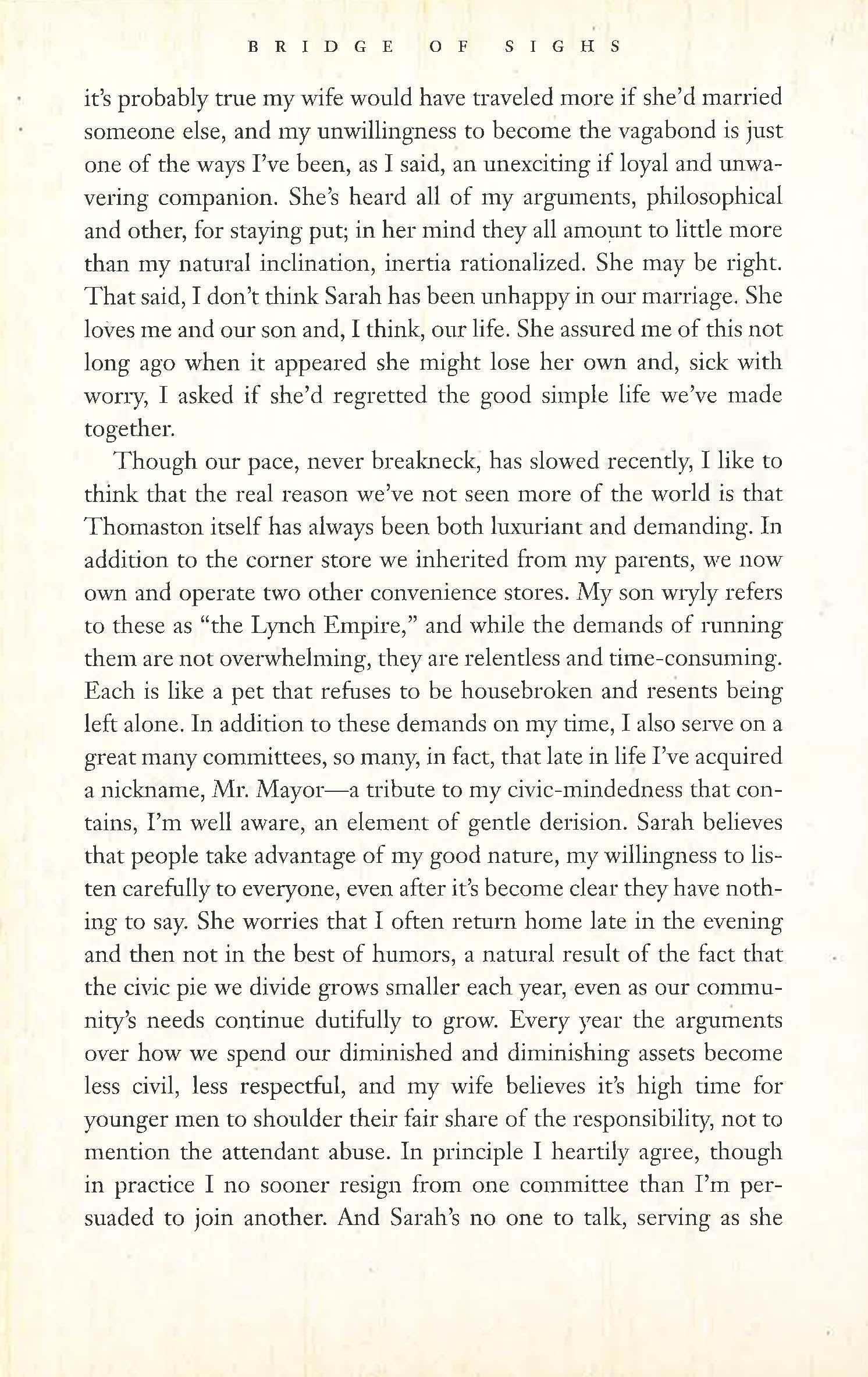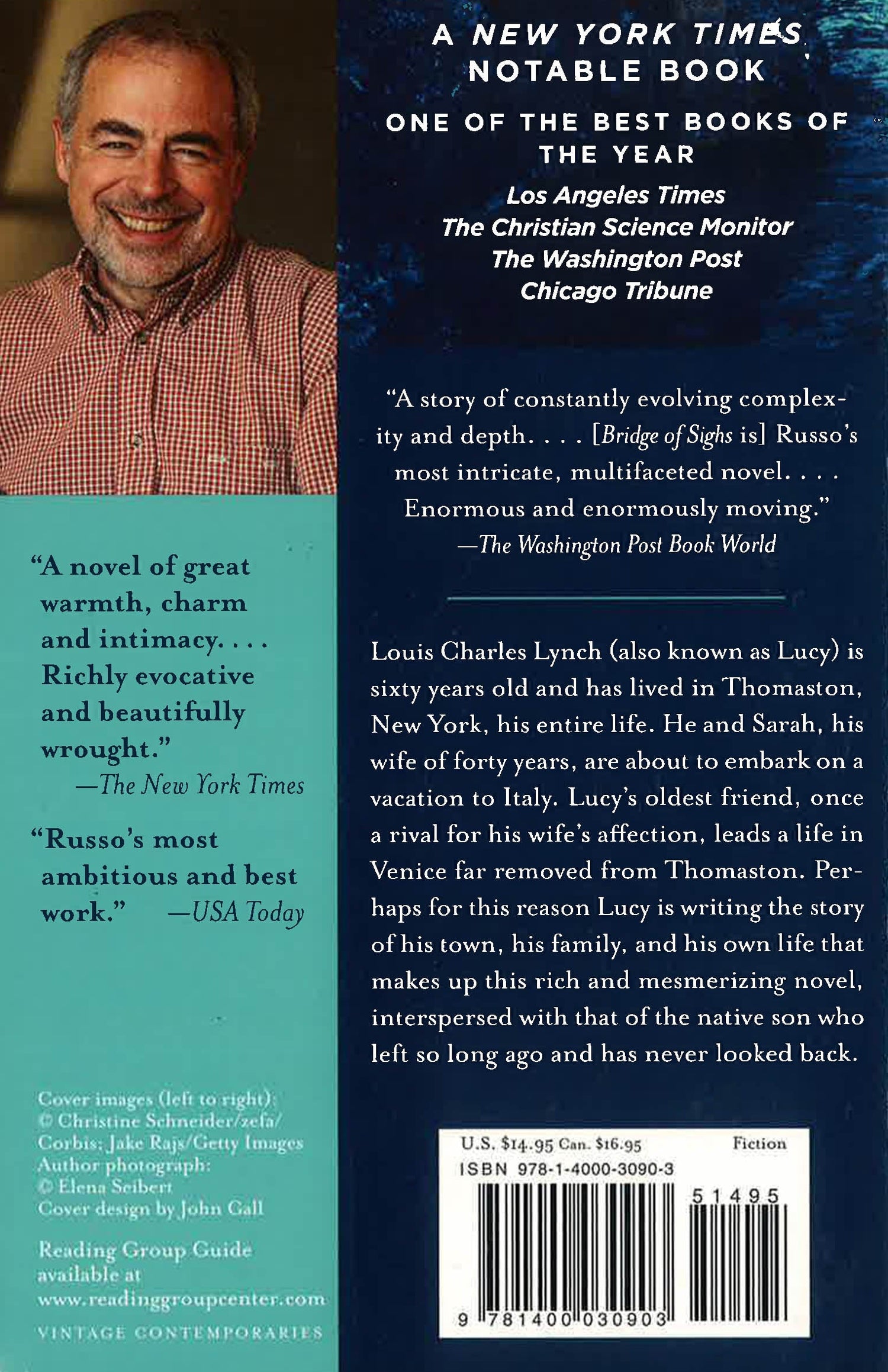 Louis Charles Lynch (also known as Lucy) is sixty years old and has lived in Thomaston, New York, his entire life. He and Sarah, his wife of forty years, are about to embark on a vacation to Italy. Lucy's oldest friend, once a rival for his wife's affection, leads a life in Venice far removed from Thomaston. Perhaps for this reason Lucy is writing the story of his town, his family, and his own life that makes up this rich and mesmerizing novel, interspersed with that of the native son who left so long ago and has never looked back. Bridge of Sighs, from the beloved Pulitzer Prize-winning author of Empire Falls, is a moving novel about small-town America that expands Russo's widely heralded achievement in ways both familiar and astonishing. *This book may have remainder mark*