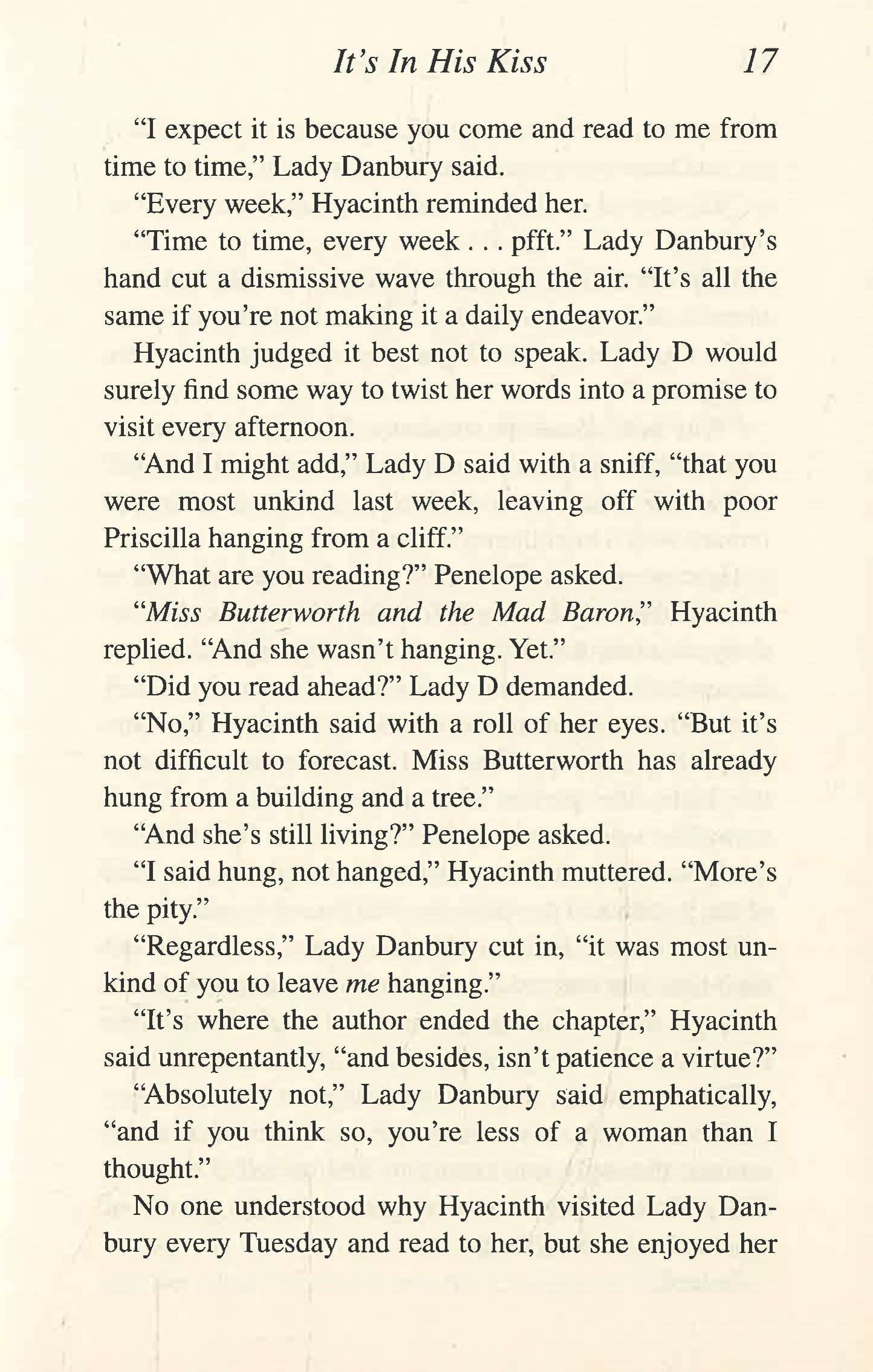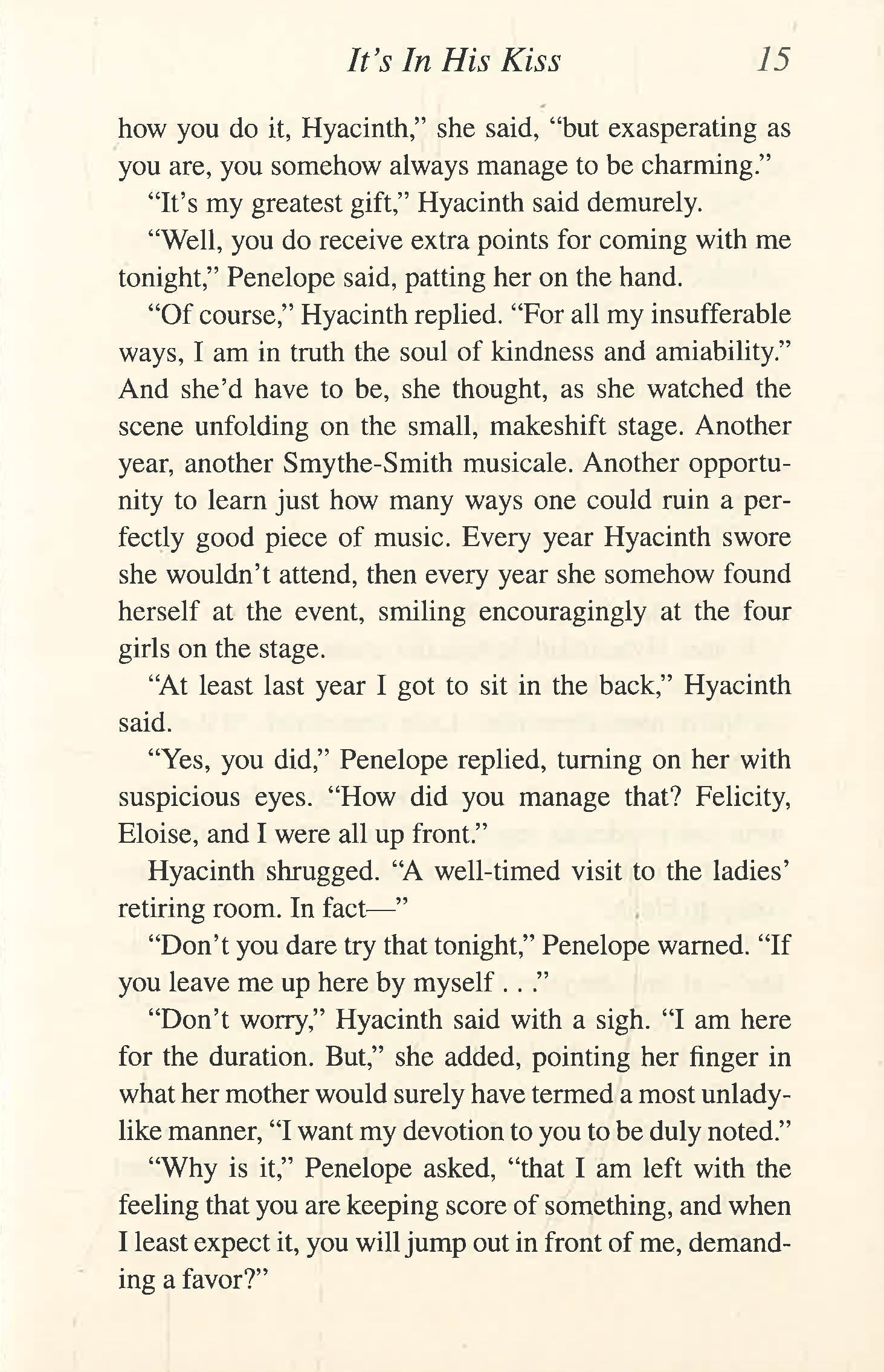 Or don’t. But rest assured, he’s spinning in his grave when Gareth and Hyacinth cross paths at the annual—and annually discordant—Smythe-Smith musicale. To Hyacinth, Gareth’s every word seems a dare, and she offers to translate his diary, even though her Italian is slightly less than perfect. But as they delve into the mysterious text, they discover that the answers they seek lie not in the diary, but in each other . . . and that there is nothing as simple—or as complicated—as a single, perfect kiss.