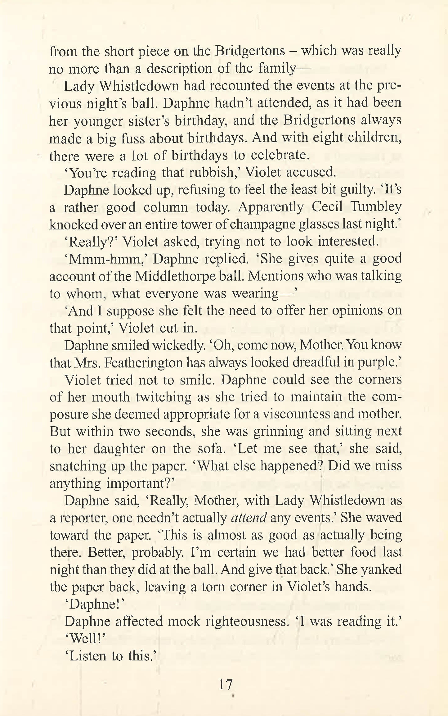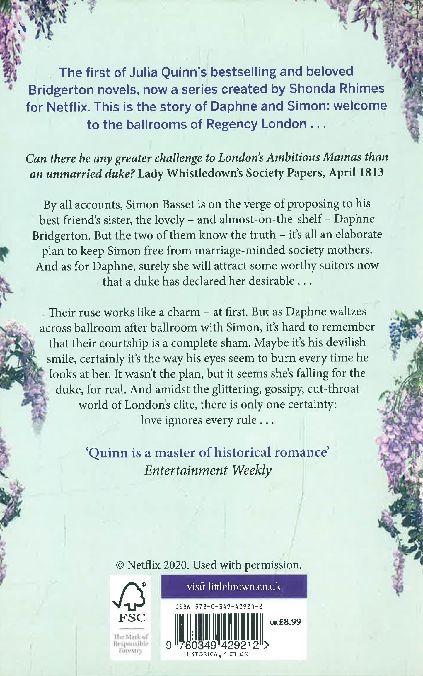 By all accounts, Simon Basset is on the verge of proposing to his best friend's sister, the lovely - and almost-on-the-shelf - Daphne Bridgerton. But the two of them know the truth - it's all an elaborate plan to keep Simon free from marriage-minded society mothers. And as for Daphne, surely she will attract some worthy suitors now that it seems a duke has declared her desirable . . .