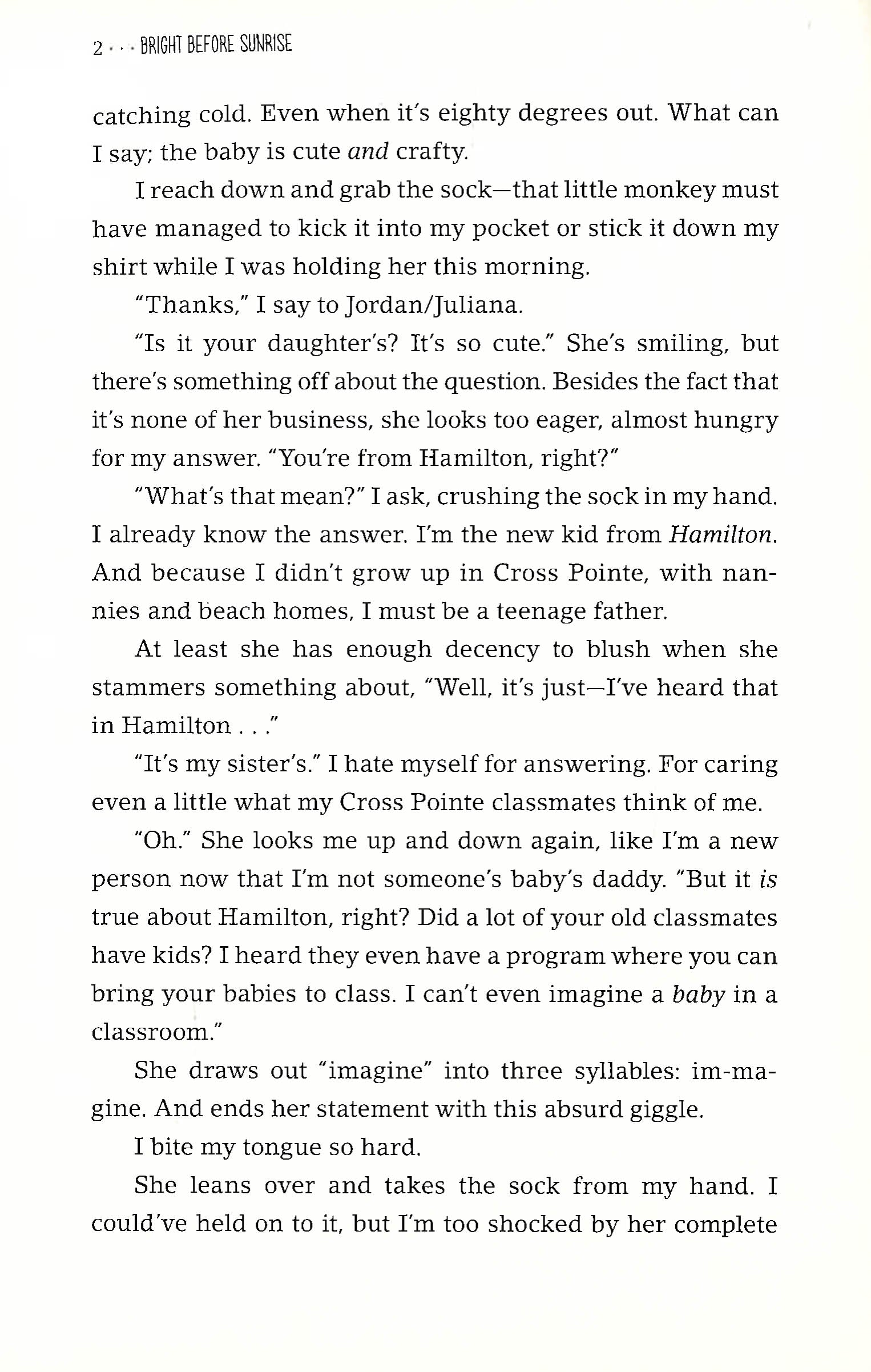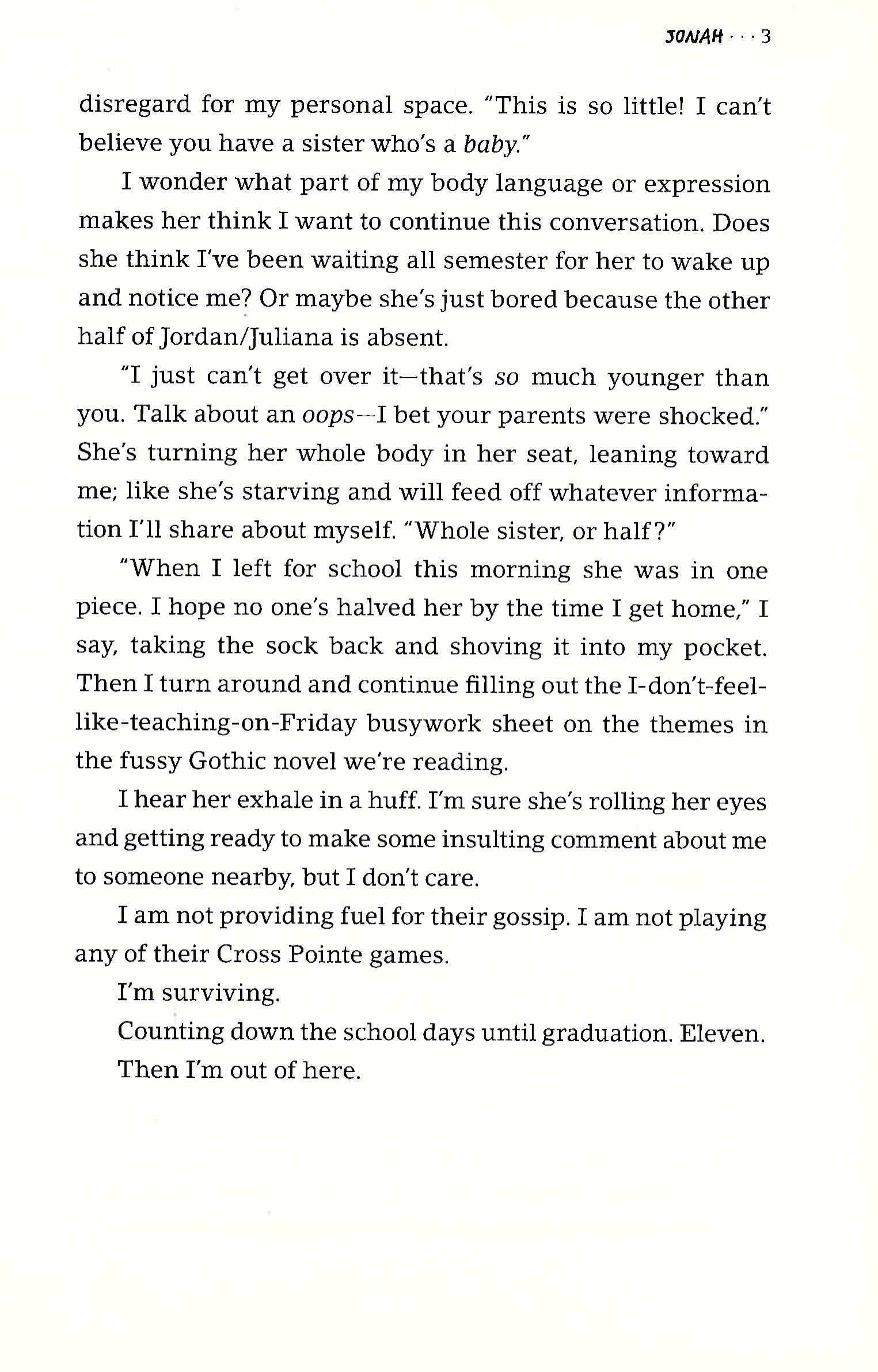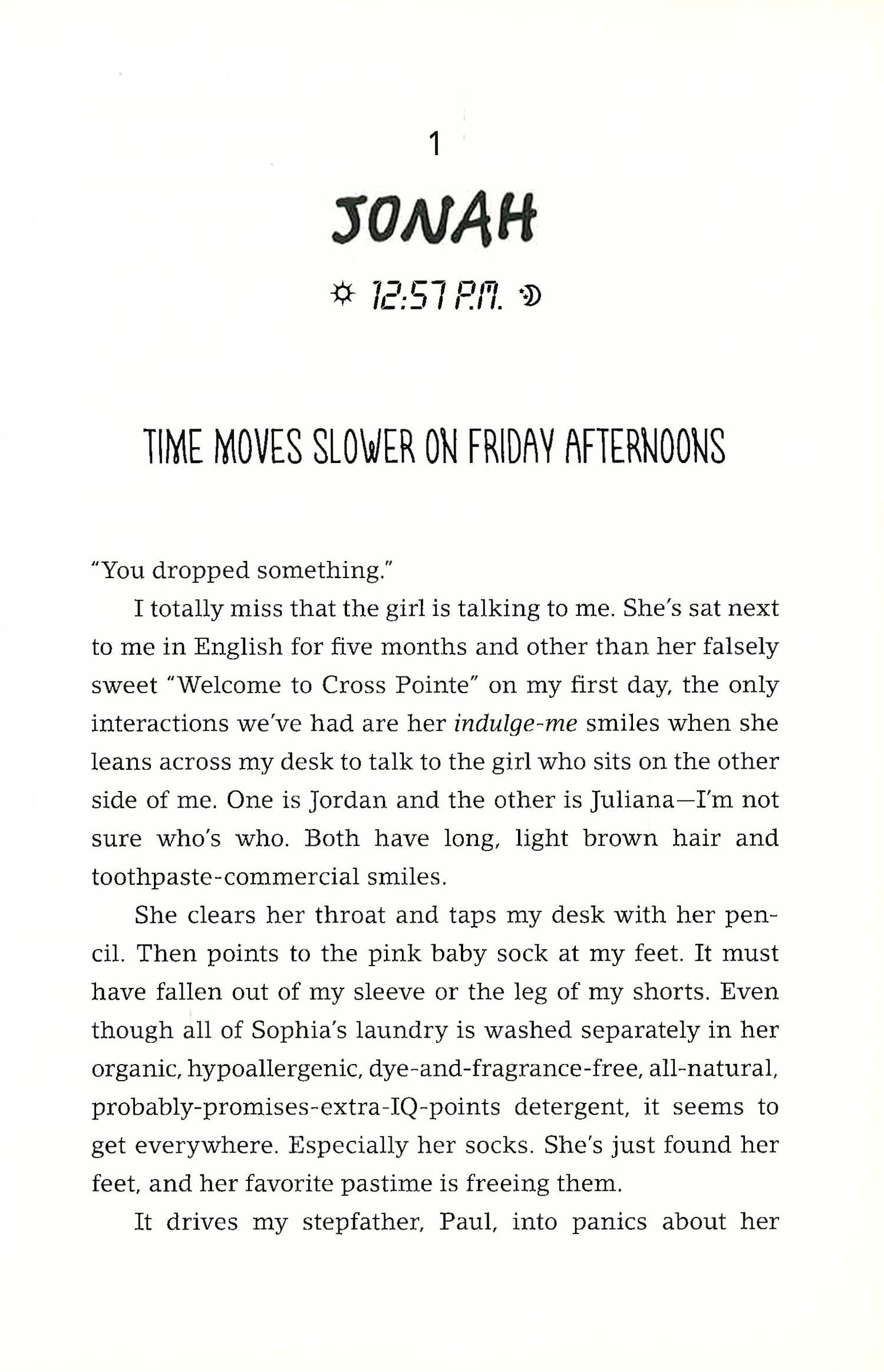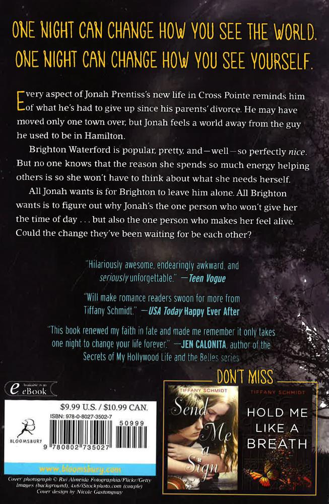 Jonah and Brighton are about to have the most awkwardly awful night of their lives. For Jonah, every aspect of his new life reminds him of what he has had to give up. All he wants is to be left alone. Brighton is popular, pretty, and always there to help anyone . . . but has no idea of what she wants for herself. Her seemingly perfect life is marred only by Jonah, the one person who won't give her the time of day, but also makes her feel, well, something. So when they are repeatedly thrown together over the course of one night, anything can--and does--happen. Told in alternating chapters, this poignant, beautiful novel's energy and tension, amidst the humor and romance, builds to a new beginning of self-acceptance and hope.