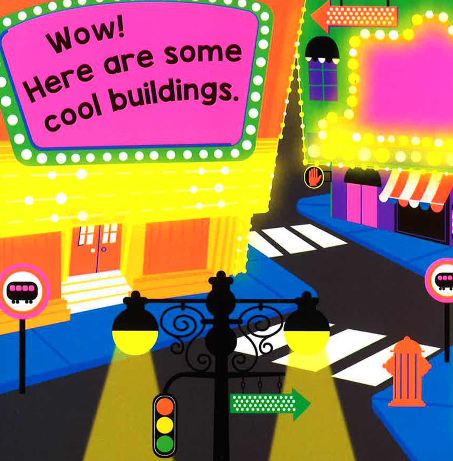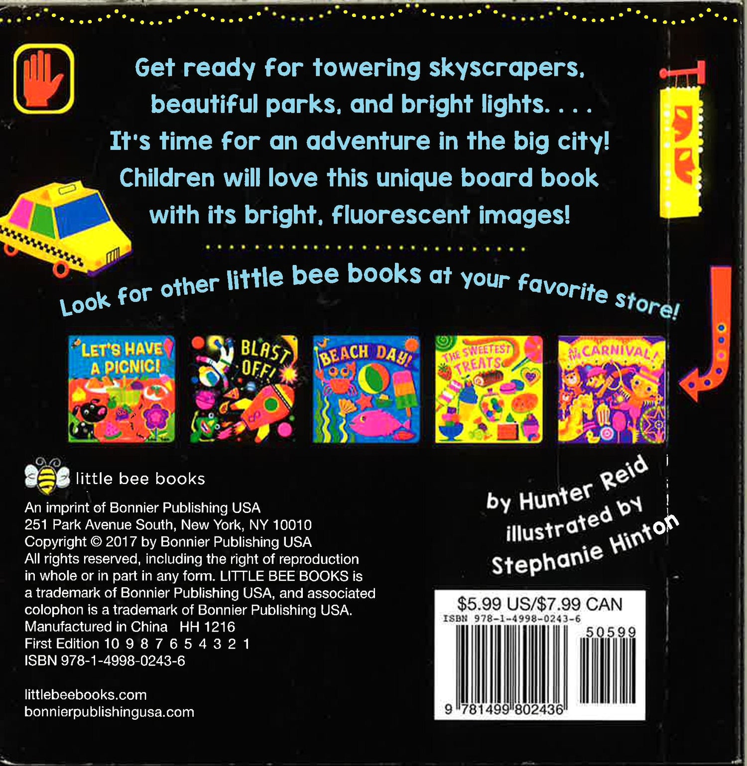 A unique board book with bright, fluorescent images of city sights! It's time to visit the city! There are all types fluorescent city sights featured in this book, including towering skyscrapers, big freeways, neon lights, huge bridges, beautiful parks, and much more! The scenes are accompanied by simple, descriptive phrases on each page. With bright, fluorescent colors, this book is sure to catch children's and parents' eyes!