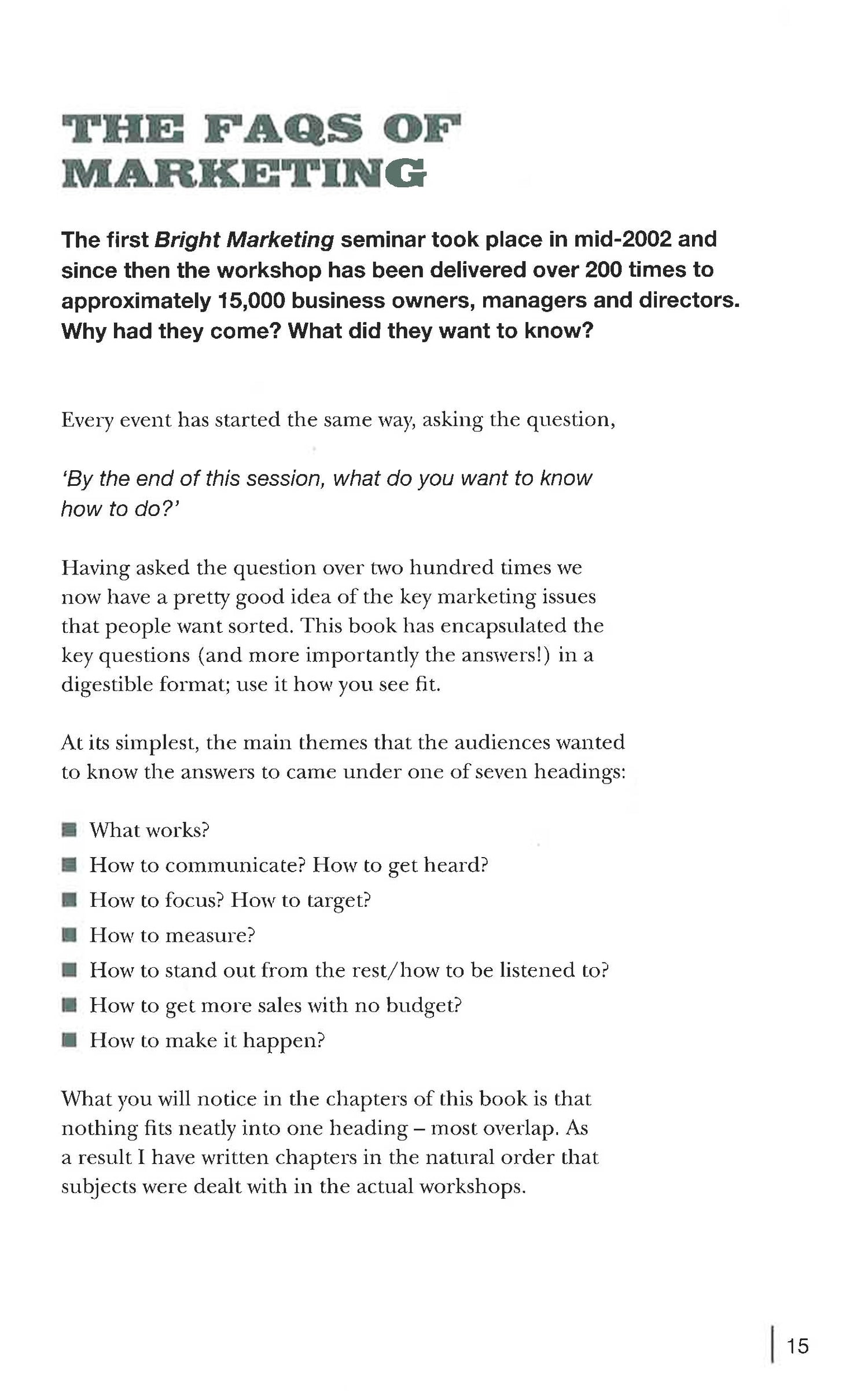 Look at your business through the eyes of your customer. Why should people bother to buy from you when they can buy from the competition? How can your marketing reach out to your customers? And what makes your business different from the rest? As a small business owner these are questions you will have to be able to answer confidently and assertively to make your business a success. You probably won't be the person marketing the product, but you are the person who best understands your business and your sales proposition and you need to ensure your marketing activity is aligned to your business plan. Bright Marketing for Small Business understands this and gives company owners and directors confidence to implement a hooked up marketing plan from research to sales. Author Robert Craven helps you pinpoint: * Who you want to be communicating with (your target audience) * What method of communication is most suitable (email, letter, phone call, Twitter?) * What your message should be (your sales proposition) Remember, in today's increasingly competitive marketplaces, people have a choice. They can buy from the 'me too' mediocrity or they can buy from the market leaders. Whether you trade locally, regionally, nationally or internationally, Bright Marketing for Small Business helps you look at your business through the eyes of your customer and put yourself ahead of the competition. Robert Craven has an extensive and practical experience of business marketing and currently the managing director of the Directors' Centre, Robert writes in an informal style which makes Bright Marketing both practical and inspiring.
