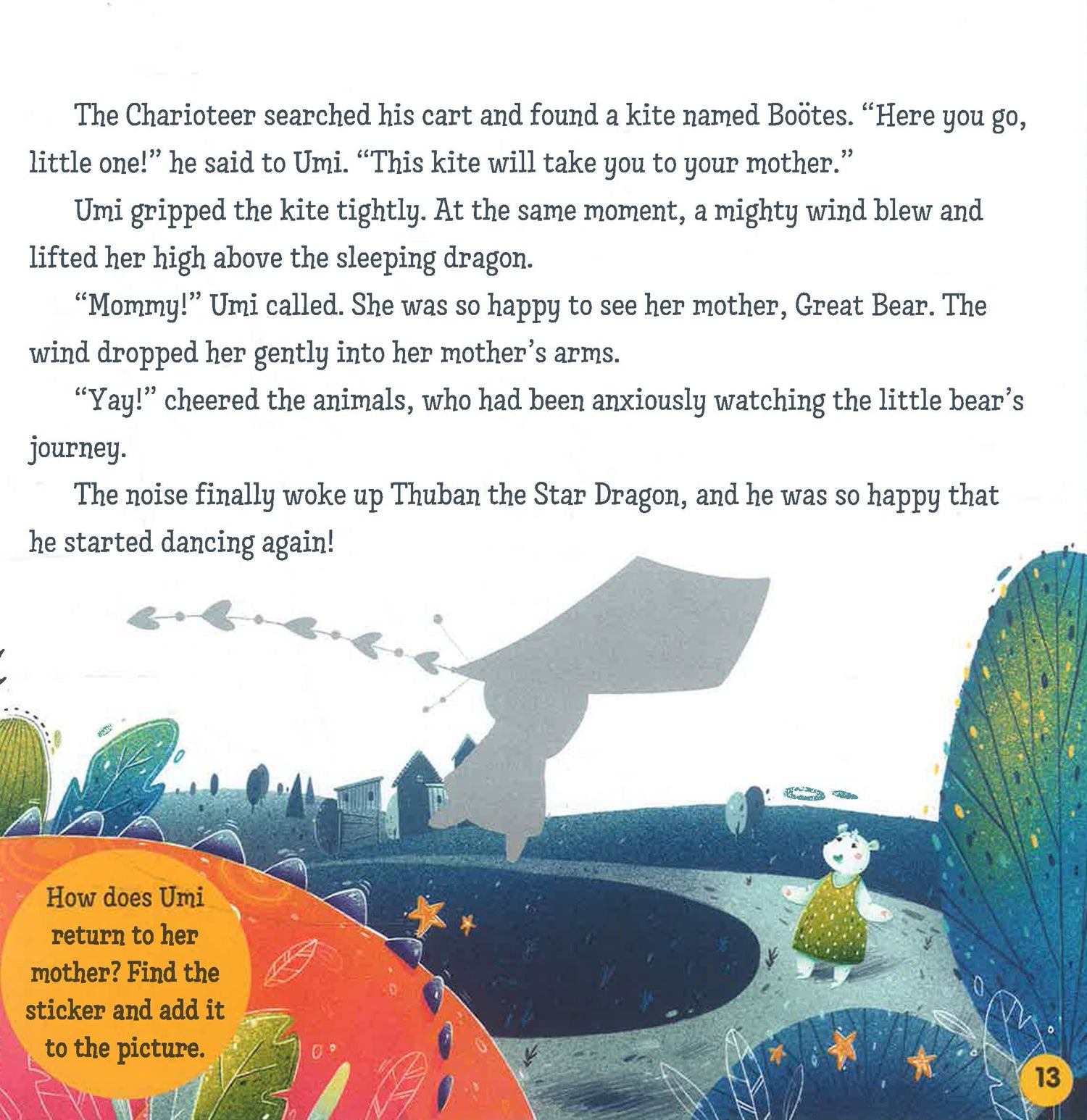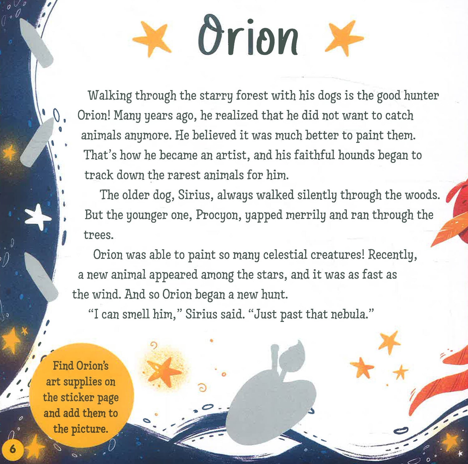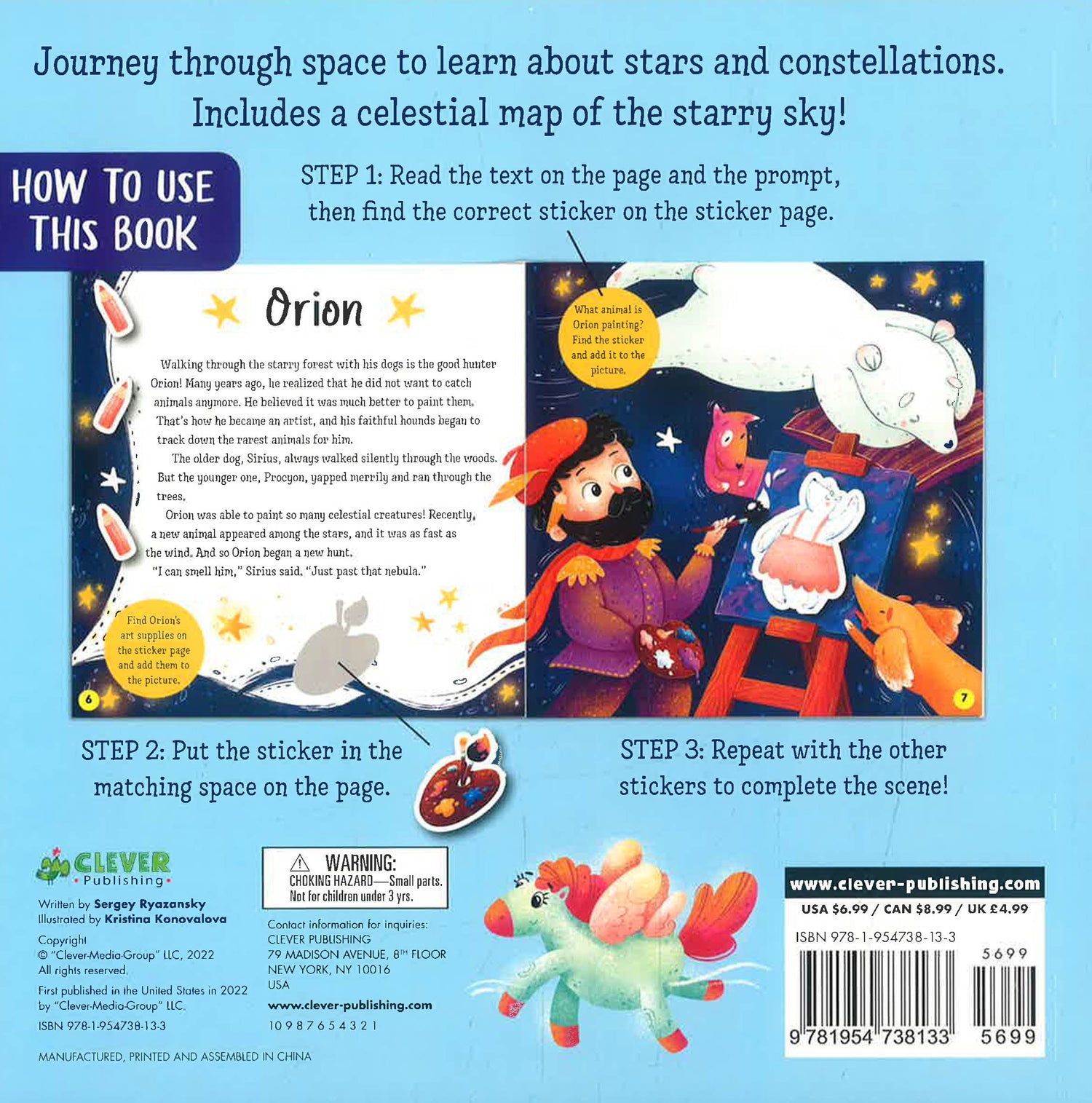 This interactive, colorful storybook features tales about the constellations found in the northern hemisphere. Told by famous Russian space pilot Sergey Ryazansky, each story introduces young readers to a number of characters that are part of the northern hemisphere constellations, such as Orion, Sirius, Ursa Major and Ursa Minor,Cassiopeia, Pegasus, and more. The stories provide a brief background to each constellation, and in a kid-friendly presentation, tells the story of each constellation so that readers can easily recall the events and remember the names of the characters. As an additional interactive activity, prompts on each spread invite children to place corresponding stickers on the page to help complete the illustration of the story. The book includes an introduction by the author, a full spread visual of the constellations that are found in the northern hemisphere, and 24 stickers that can be added to complete the scenes in each story.