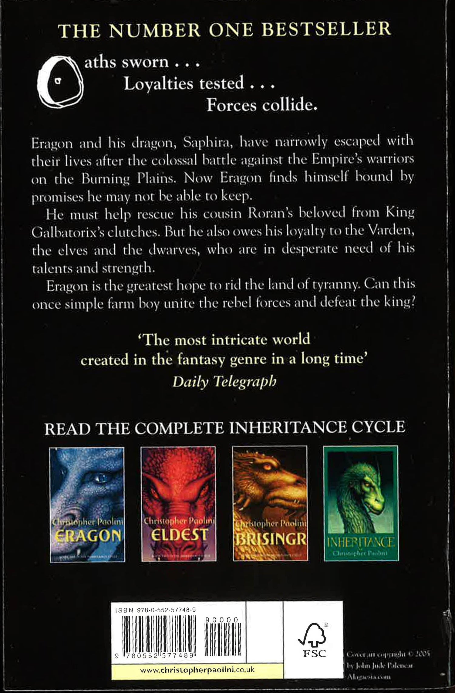 Conflict, action, adventure and one devastating death await readers as Eragon battles on behalf of the Varden while Galbatorix ruthlessly attempts to crush and twist him to his own purposes.