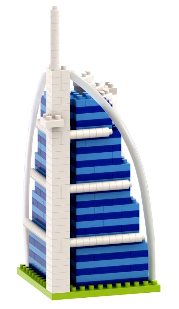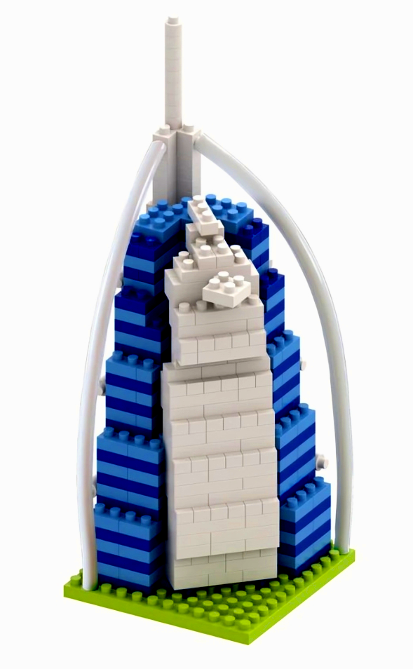 The "BRIXIES Burj Al Arab" kit consists of a total of 355 stones and, when assembled, is 15.5 cm long, 4.8 cm wide and 4.8 cm high.