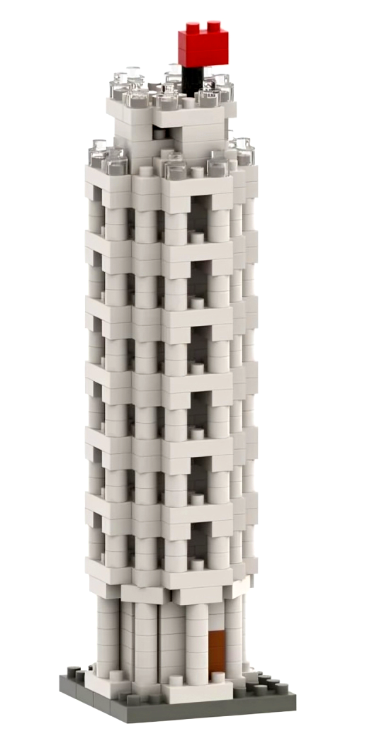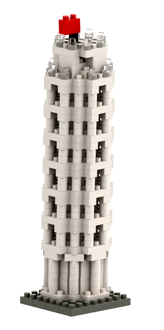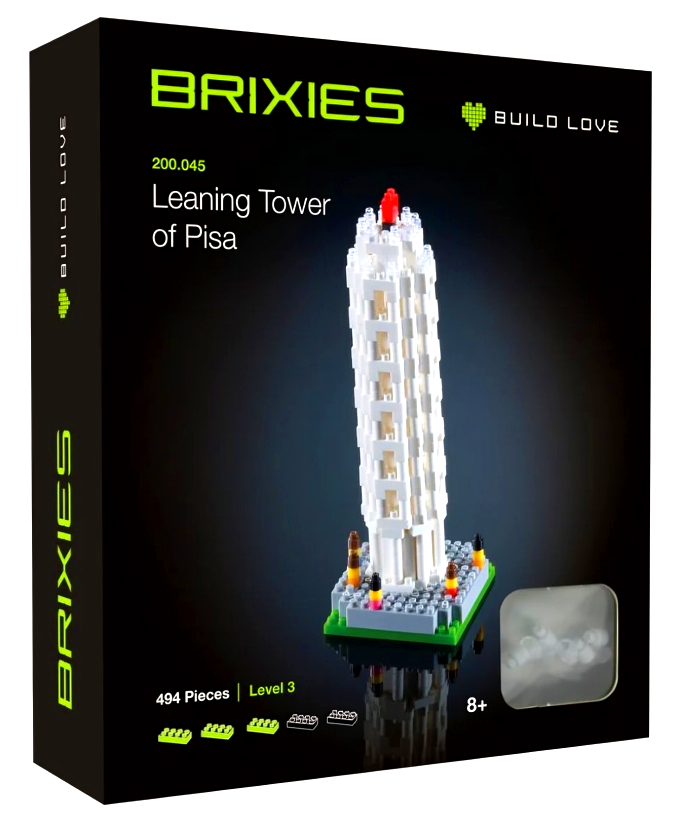 The "BRIXIES Leaning Tower of Pisa" set consists of a total of 494 stones and, when assembled, is 13.5 cm long, 4.8 cm wide and 4.8 cm high. The BRIXIES building block sets are suitable for ages 8 and up. The building blocks are made of high-quality ABS plastic and meet the latest safety standards. This level 3 kit promotes skill and concentration while also being a lot of fun.