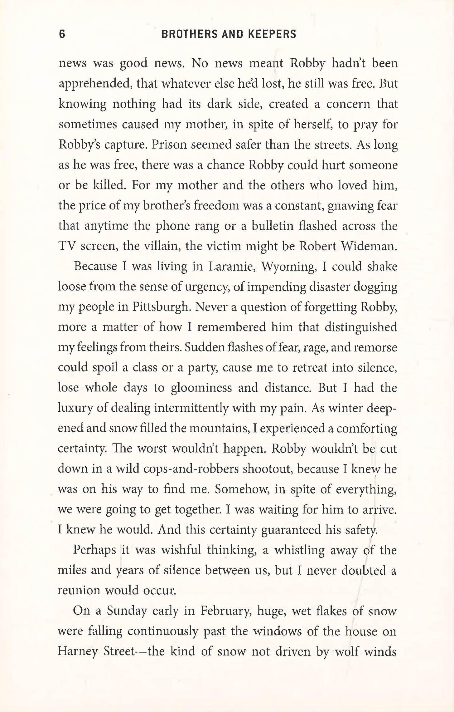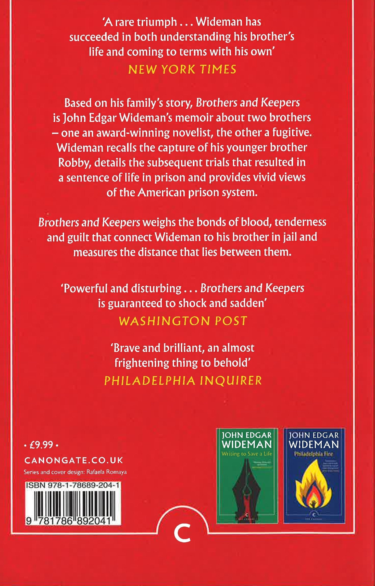 Brothers and Keepers is John Edgar Wideman's seminal memoir about two brothers - one an award-winning novelist, the other a fugitive. Wideman recalls the capture of his younger brother Robby, details the subsequent trials that resulted in a sentence of life in prison, and provides vivid views of the American prison system. A gripping, unsettling account, Brothers and Keepers weighs the bonds of blood, tenderness and guilt that connect him to his brother and measures the distance that lies between them.