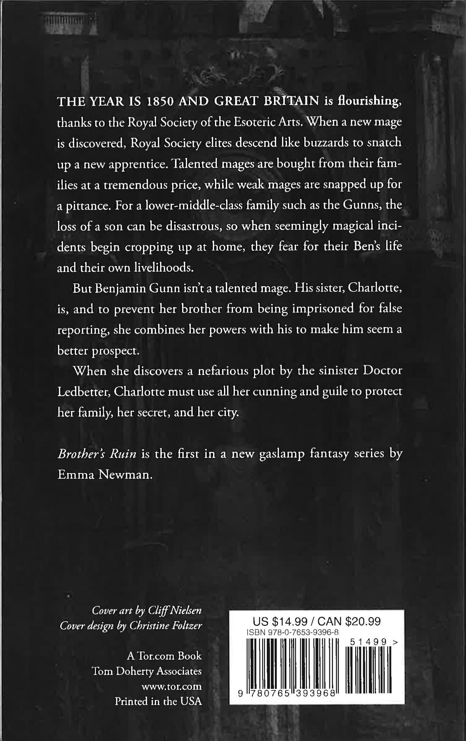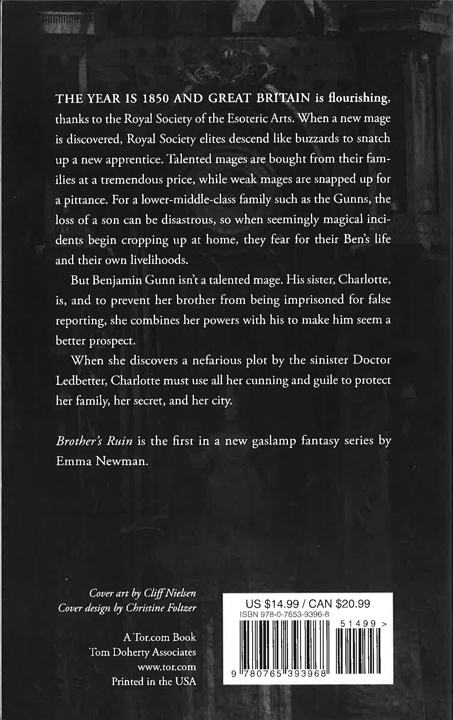 The year is 1850 and Great Britain is flourishing, thanks to the Royal Society of the Esoteric Arts. When a new mage is discovered, Royal Society elites descend like buzzards to snatch up a new apprentice. Talented mages are bought from their families at a tremendous price, while weak mages are snapped up for a pittance. For a lower middle class family like the Gunns, the loss of a son can be disastrous, so when seemingly magical incidents begin cropping up at home, they fear for their Archie's life and their own livelihoods.But Archie Gunn isn't a talented mage. His sister Charlotte is, and to prevent her brother from being imprisoned for false reporting she combines her powers with his to make him seem a better prospect. However, maintaining the charade will mean masquerading as Archie's assistant, and delaying or destroying her own plans for marriage.When she discovers a nefarious plot by the sinister Doctor Ledbetter, Charlotte must use all her cunning and guile to protect her family, her secret and her city.Brother's Ruin is the first in a new gaslamp fantasy series by Emma Newman.