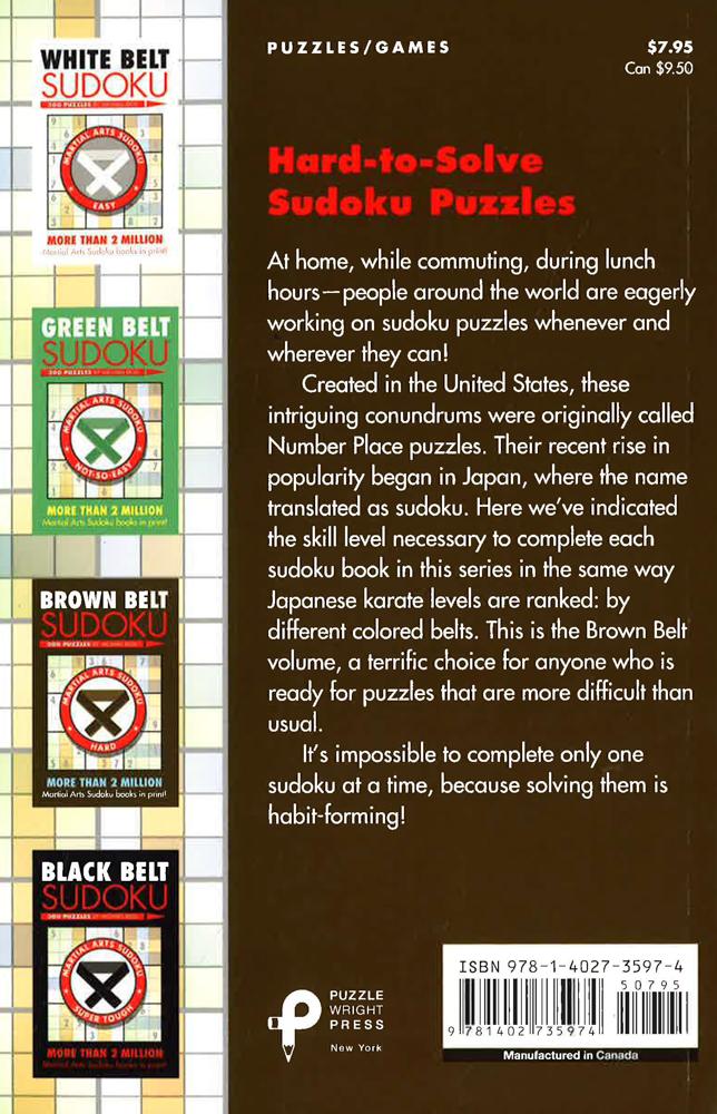 With a separate sudoku book for every level, all puzzle lovers can play this wildly popular, incredibly addictive game that's appearing in major newspapers all over! Taking a page from karate - another Japanese art - each title is graded by color: White Belt for easy, Green Belt for medium level, Brown Belt for hard, and Black Belt for the super-tough solvers. And because each book has an amazing 300 puzzles, the fun can go on for hours.